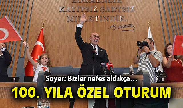 100 yıl önce Cumuhriyet’in ilan edildiği süreci hatırlatarak sözlerine başlayan Soyer, “100 yıl önce bugün, Cumhuriyet’in tatlı güneşi bu topraklar üzerinde bir daha hiç batmamak üzere doğdu. Onlarca yıl süren hazin savaşların, yokluğun, imkansızlığın içinde Kurtuluş Destanı’nı yazan milletimiz, o destanı Cumhuriyetle mühürledi. Aziz vatanda, 100 yıldır üzerine bir an dahi gölge düşmeyen barış işte böyle filizlendi. Cumhuriyeti, biz böyle kazandık. 100 yıl sonra bugün yine bir Cumhuriyet meclisinde bir aradayız. Türkiye Cumhuriyeti’nin yüzüncü yılını büyük bir gururla kutluyoruz. Bu resim Cumhuriyetin, demokrasinin, hukukun üstünlüğünün ve çokluk içindeki birliğimizin resmidir. Bugün bu resmin içerisinde bir yere sahipsek bunu yüzyıl önce bütün imkansızlıklar içinde Cumhuriyeti kuran atalarımıza borçluyuz. Başta Ulu Önderimiz Mustafa Kemal olmak üzere, her birinin aziz hatırası önünde saygı ve minnetle eğiliyorum. Size söz! Bizler nefes alıp verdiğimiz sürece Cumhuriyet payidar kalacak” dedi.