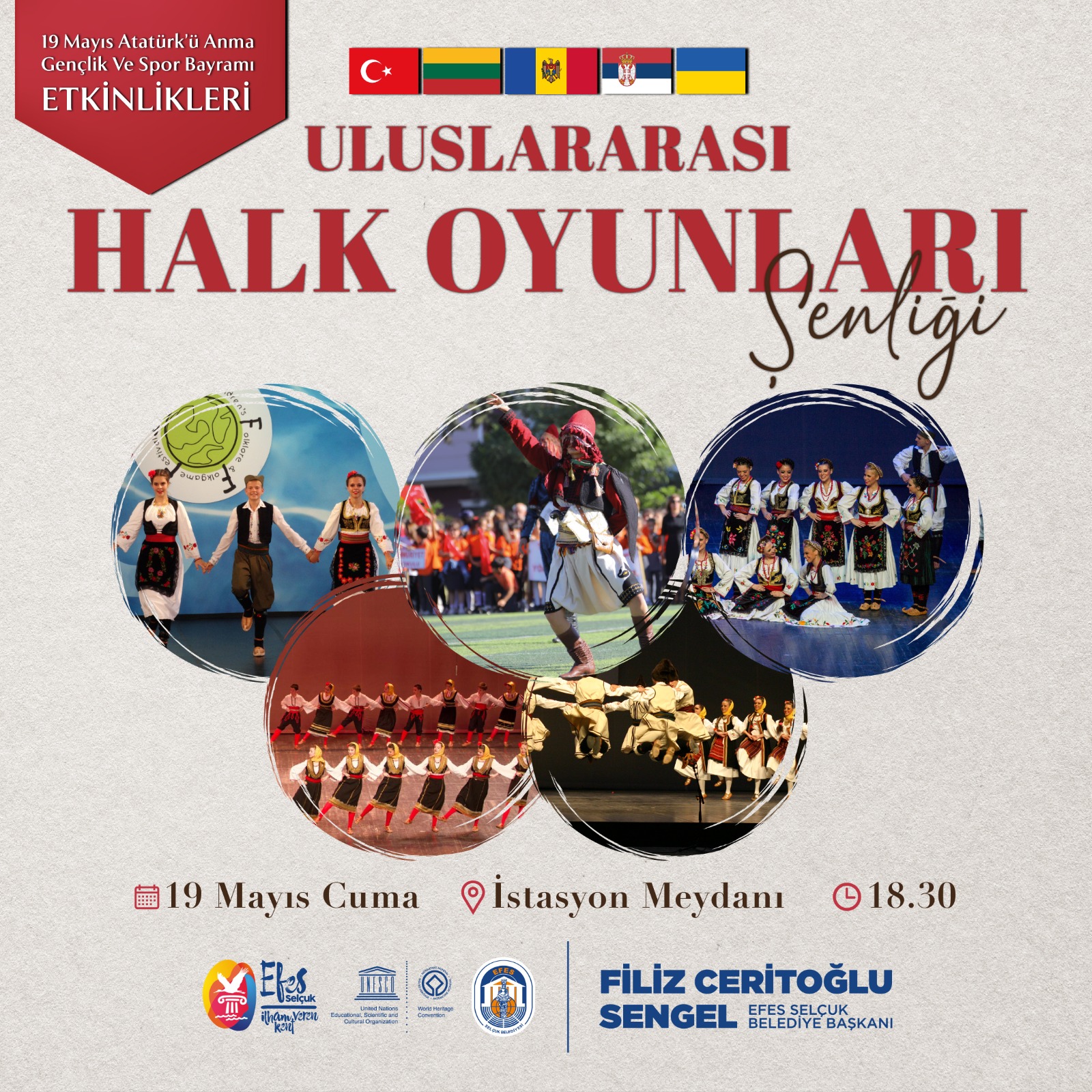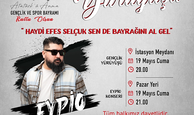 19 Mayıs Cuma günü saat 09.00’da Atatürk Anıtı önünde başlayacak resmi törenin ardından kutlamalar saat 10.00’da tören alanında devam edecek.Efes Selçuk Belediyesi tarafından 19 Mayıs Atatürk’ü Anma Gençlik ve Spor Bayramı nedeniyle düzenlenecek Uluslararası Halk Oyunları şenliği kapsamında Sırbistan, Ukrayna, Moldova ve Litvanya’dan gelecek beş ekip halk oyunları gösterisi sunacak. Şenliğe Efes Selçuk’tan da üç halk oyunu ekibi katılacak. Uluslararası Halk Oyunları Şenliği 19 Mayıs günü saat 18.30’da İstasyon Meydanı’nda başlayacak.Uluslararası Halk Oyunu Şenliği’nin ardından saat 20.00’de İstasyon Meydanı’nda fener alayı yürüyüşü başlayacak. “Haydi efes selçuk sen de bayrağını al gel” sloganı ile İstasyon Meydanı’ndan başlayacak olan yürüyüş Pazar Yeri’nde son bulacak.Pazar Yeri’nde sona erecek Fener Alayı Yürüyüşünün ardından 19 Mayıs Atatürk’ü Anma Gençlik ve Spor Bayramı etkinlikleri saat 21.00’de Pazar Yeri’nde Eypio Konseri ile devam edecek.