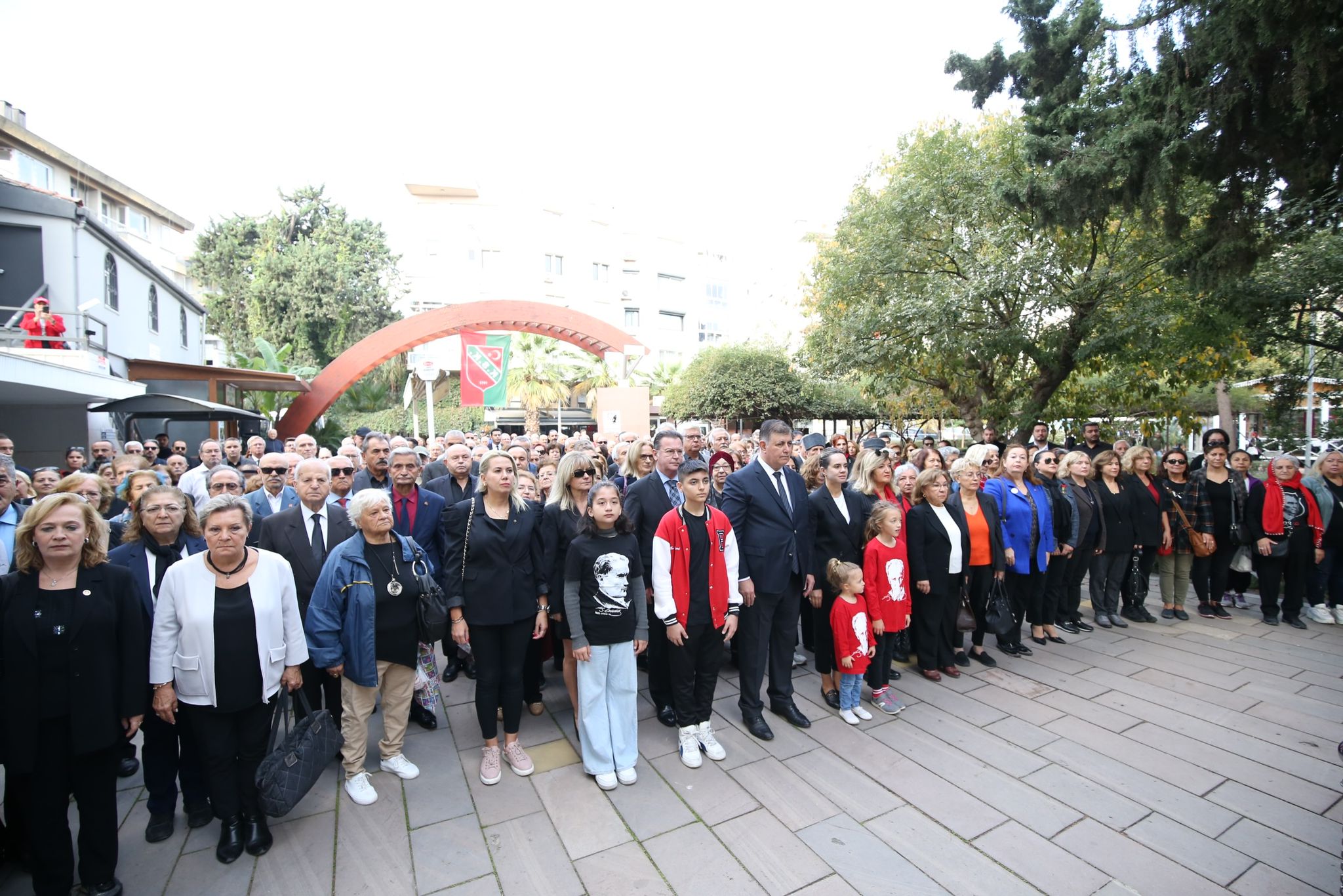 Karşıyaka Hükümet Konağı önünde yüzlerce Karşıyakalının katılımıyla yapılan törende Atatürk Anıtı’na çelenkler sunuldu. Ulu Önder Mustafa Kemal Atatürk’ün ebediyete intikal ettiği anda, saatler 09.05’i gösterdiğinde tüm yurtta olduğu gibi Karşıyaka’da da hayat adeta durdu. Caddeler ve sokaklardaki tüm yurttaşlar saygı duruşuna geçti. 2 dakika boyunca siren ve korna sesleri ilçenin dört bir yanında yankılanırken, duygu dolu anlar yaşandı. Saygı duruşunun ardından Karşıyakalılar, Ulu Önder’in Annesi Zübeyde Hanım'ın Anıt Mezarı’nı ziyaret etti. Karşıyaka Belediye Başkanı Dr. Cemil Tugay, eşi Öznur Tugay, CHP Karşıyaka İlçe Başkanı Levent Güçlü, meclis üyeleri, demokratik toplum örgütlerinin yönetici ve üyeleri, her yaştan Karşıyakalı, Zübeyde Hanım Anıt Mezarı’na karanfil bıraktı.