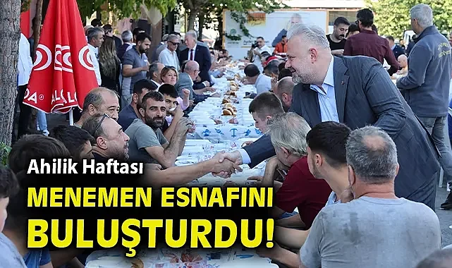 Menemen'de Ahilik Haftası, gönülleri buluşturan kahvaltı sofrasında kutlandı. Menemen Belediye Başkanı Aydın Pehlivan'ın ev sahipliğinde Menemen Sanayi Sitesi'nde gerçekleştirilen buluşmaya, İzmir Esnaf ve Sanatkârlar Odaları Birliği Başkanı Yalçın Ata, Menemen'de bulunan odaların başkan ve yöneticileri, Menemen Cumhuriyet Başsavcısı Hüseyin Kaçar, Menemen İlçe Emniyet Müdürü Gürcan Alev ve sanayi sitesi esnafı katıldı.