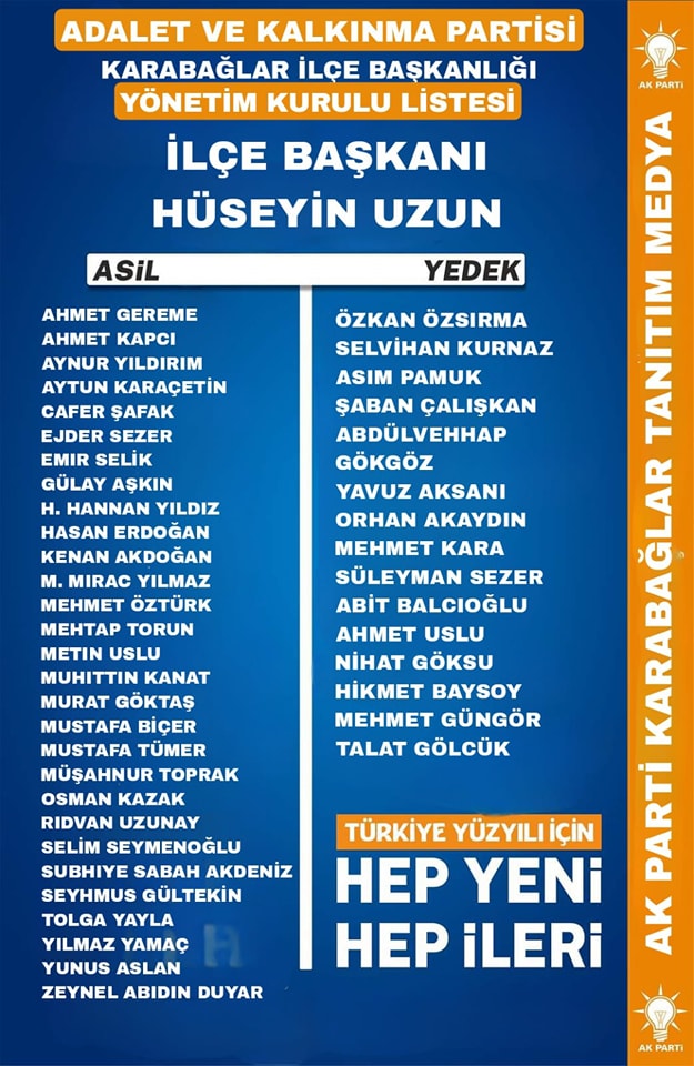 AGORAMEDYA - Adalet ve Kalkınma Partisi Karabağlar İlçe Başkanlığı'nın yönetim kurulu listesi açıklandı. "Türkiye Yüzyılı için hep yeni, hep ileri" notuyla paylaşılan listede, asil ve yedek üyeler şu şekilde kendine yer buldu: