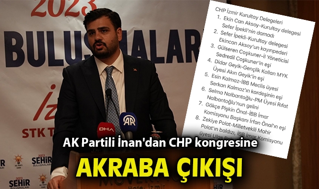 AK Parti Gençlik Kolları Başkanı ve İzmir Milletvekili Eyyüp Kadir İnan sosyal medya hesabından, CHP İzmir Kurultay delegelerinin olduğu bir liste paylaştı. Paylaşımında "Kongre değil akraba buluşması... Özellikle İzmir'deki CHP'li gençler için çok üzüldüm." ifadelerini kullanan İnan, delegelerin akrabalıklarına dikkat çekti. İnan'ın paylaşımı şu şekilde: