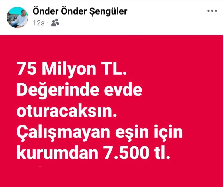 Önder Şengüler sosyal medya hesabından yaptığı son paylaşımla yeni bir tartışmanın fitilini ateşledi.Şengüler, paylaşımında şu ifadeleri kullandı:"75 milyon TL değerinde evde oturacaksın. Çalışmayan eşin için 7 bin 500 TL çalışmayan eş maaş desteği talep edeceksin. Gözünüzü toprak doyursun."Bu sözler, kamuoyunda büyük yankı uyandırırken, Şengüler’in kimi hedef aldığı merak konusu oldu. Özellikle belediye yönetiminde görev yapan bir başkan yardımcısına yönelik bir itham olduğu yönündeki iddialar dikkat çekti.