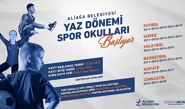 Yaz dönemi spor okullarında bu yıl futbol kurslarına 2011-2012-2013-2014-2015; Basketbol kurslarına 2011-2012-2013-2014-2015; Güreş kurslarına 2011-2012-2013-2014-2015; Karate kurslarına 2014-2015-2016-2017; Voleybol kurslarına 2012-2013-2014-2015; Cimnastik kurslarına 2016-2017-2018 doğumlular başvuru yapabilecek. Tüm branşlardaki kontenjanlar sınırlı tutulacak. Vatandaşlar, aliağa belediyesi Spor Salonu’nun 0(232) 616 5407 numaralı hattını arayarak detaylı bilgiye ulaşabilirler.