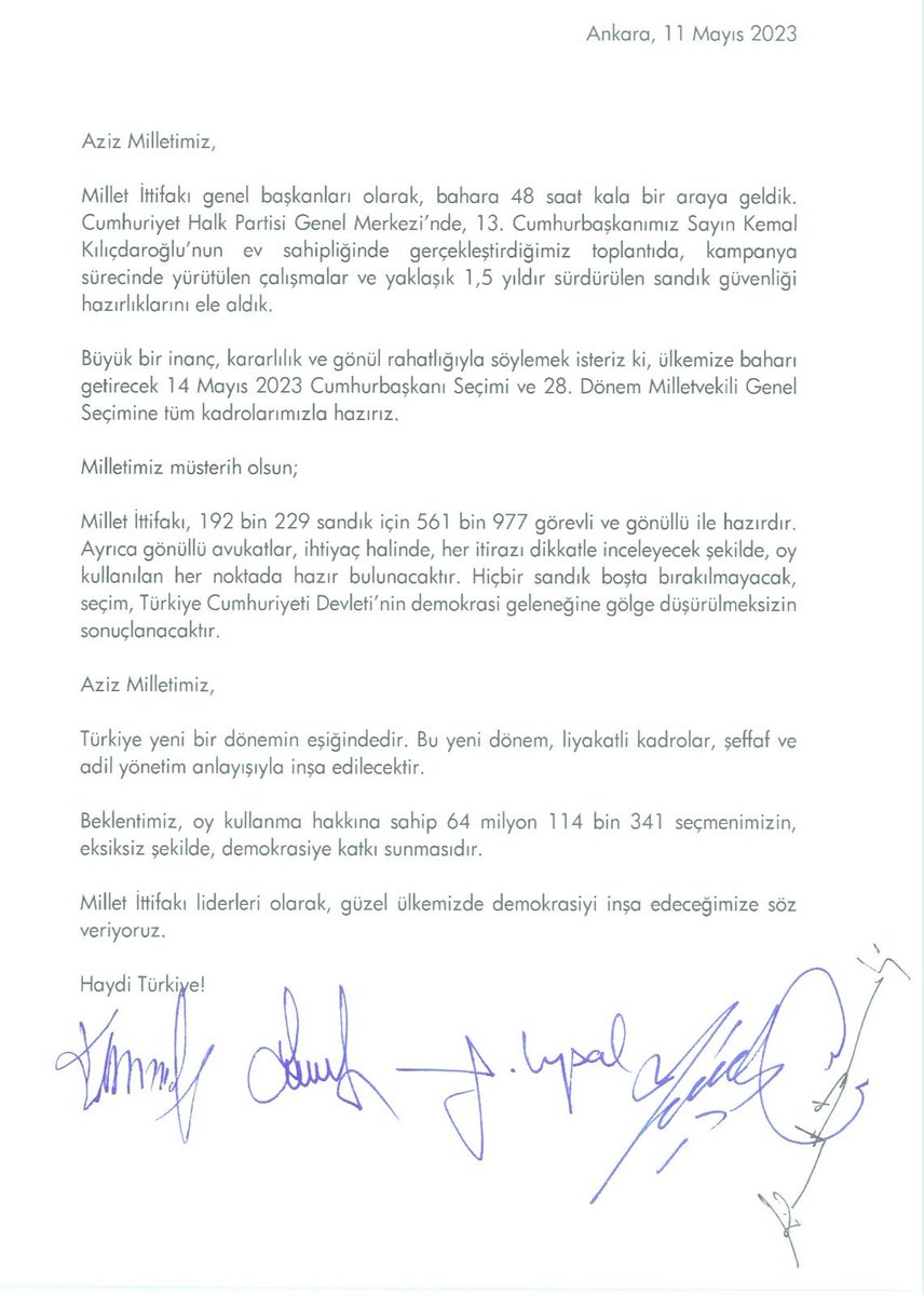 Altılı masa cumhurbaşkanlığı seçimleri için saat 22.00’de chp Genel Merkezi'nde toplandı. Kritik toplantının ardından 6 lider ortak metne imza atarak seçimlere hazır olduklarını beyan ettiler. Millet İttifakı liderlerinin yaptığı açıklamada ise: “Millet İttifakı, 192 bin 229 sandık için 561 bin 977 görevli ve gönüllü ile hazırdır” ifadeleri kullanıldı.