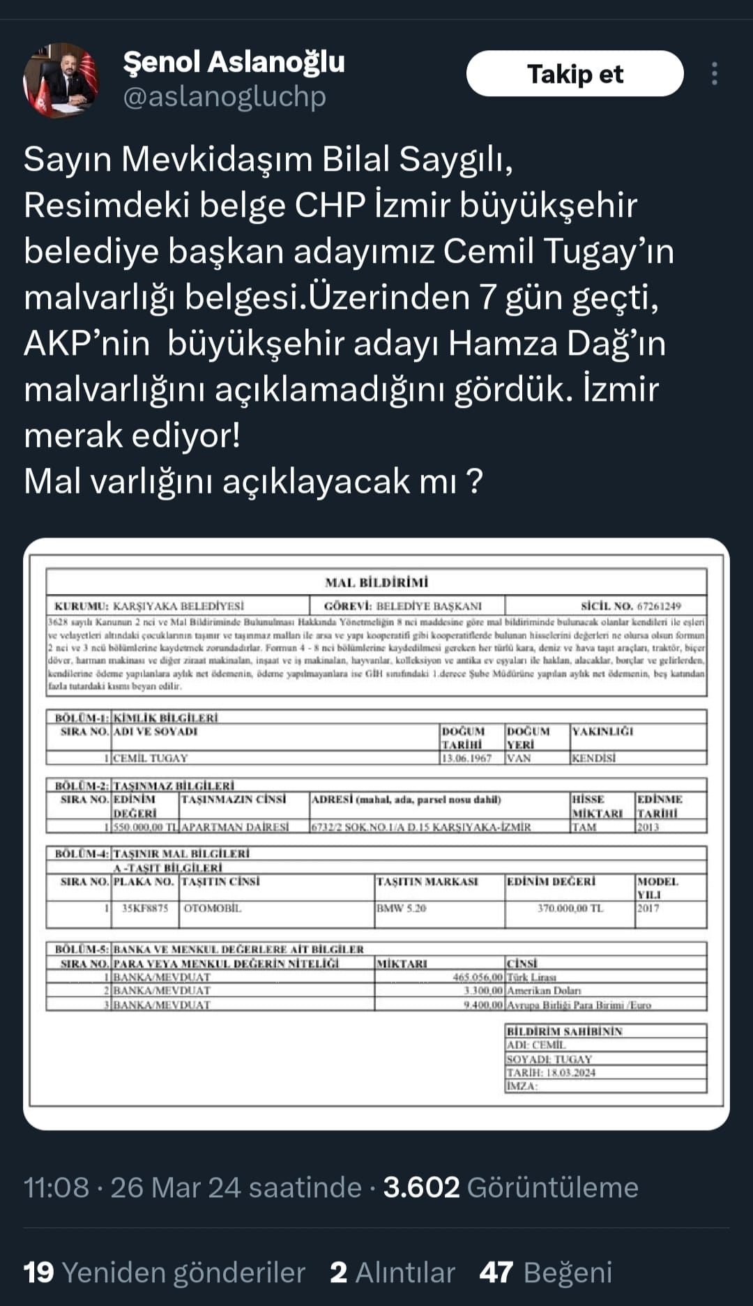 AGORA MEDYA - Yerel seçimlere günler kala İzmir siyasetinde mal varlığı tartışması yaşanıyor.Cumhuriyet Halk Partisi (CHP) İzmir İl Başkanı Şenol Aslanoğlu, sosyal medya hesaplarından AK Parti İzmir İl Başkanı Bilal Saygılı’ya seslendi.Aslanoğlu, mevkidaşı Saygılı’ya Cumhur İttifakı İzmir Büyükşehir Belediye Başkan Adayı Hamza Dağ’ın mal varlığını açıklaması için çağrıda bulundu.CHP İzmir Büyükşehir Belediye Başkan Adayı Cemil Tugay’ın mal varlığını açıkladığı belgeyi ekleyerek paylaşımda bulunan Aslanoğlu, “Sayın Mevkidaşım Bilal Saygılı, Resimdeki belge CHP İzmir büyükşehir belediye başkan adayımız Cemil Tugay’ın malvarlığı belgesi.Üzerinden 7 gün geçti, AKP’nin büyükşehir adayı Hamza Dağ’ın malvarlığını açıklamadığını gördük. İzmir merak ediyor! Mal varlığını açıklayacak mı?” ifadelerini kullandı.