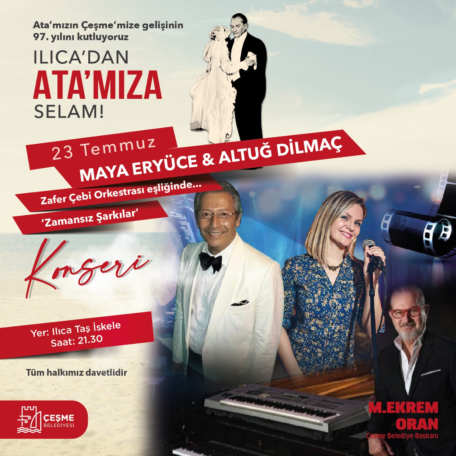 “Ilıca’da buluşalım” Herkesi Cumhuriyetin ikinci yüzyılında Mustafa Kemal’in ışığında buluşmaya davet eden Çeşme Belediye Başkanı M. Ekrem Oran; “Ata’mızın Ilıca’ya gelişinin 97. Yıl dönümünde tüm Çeşmelileri, tatil için gelen tüm misafirlerimizi, Cumhuriyetimizin ikinci yüzyılında, devrimlerin ışığında buluşmaya davet ediyorum. Mustafa Kemal’in büyük düşlerini gerçekleştirmek için O’nun izinde ilerledğimiz sürece hiçbir karanlığa teslim olmayacağız. Umutla, azimle Mavi Gözlü Dev’in yolunda yürümeye devam edeceğiz. Herkesi, Ilıca’mızın eşsiz güzelliklerini paylaşmaya, bir kez daha Ata’mıza olan sevgimizi coşkuyla haykırmaya çağrıyoruz. Bu büyük coşkuyu kaçırmayın.” dedi.Levent Kömür