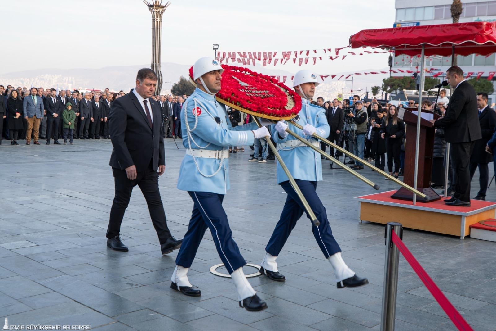 Türkiye Cumhuriyeti’nin kurucusu Ulu Önder Gazi Mustafa Kemal Atatürk, aramızdan ayrılışının 86’ncı yılında özlemle anılıyor. Gün boyu sürecek anma etkinlikleri, Cumhuriyet Meydanı’nda yapılan anma töreniyle başladı. İzmir Valiliği, Ege Ordusu ve Garnizon Komutanlığı ve İzmir Büyükşehir Belediyesi adına Atatürk Anıtı’na çelenk sunulmasıyla başlayan törene; İzmir Büyükşehir Belediye Başkanı Dr. Cemil Tugay, İzmir Valisi Dr. Süleyman Elban, Ege Ordusu ve Garnizon Komutanı Orgeneral İrfan Özsert, siyasi parti temsilcileri, milletvekilleri, sivil toplum kuruluşu, oda ve derneklerin başkanları ile temsilcileri ve yurttaşlar katıldı.