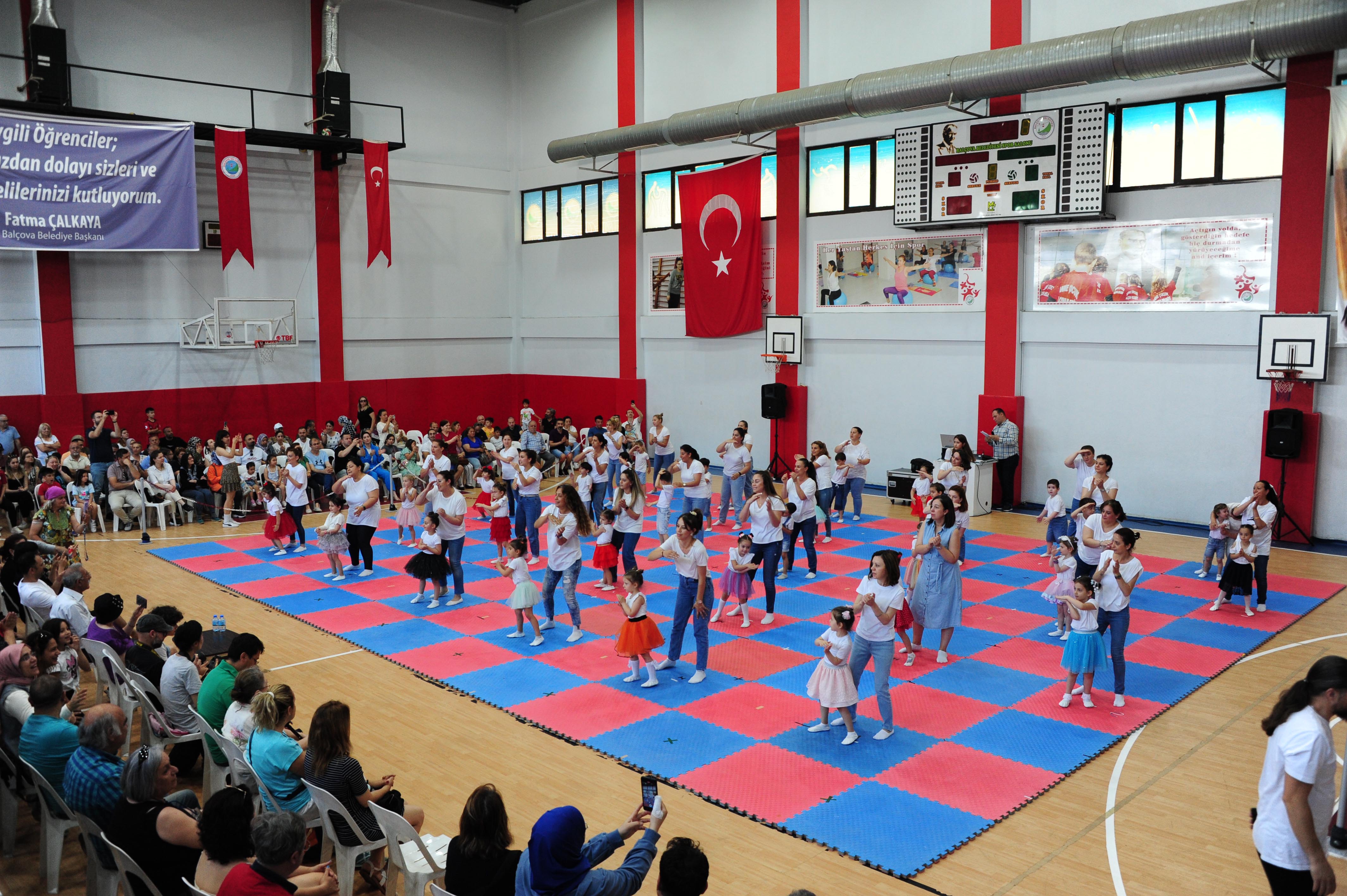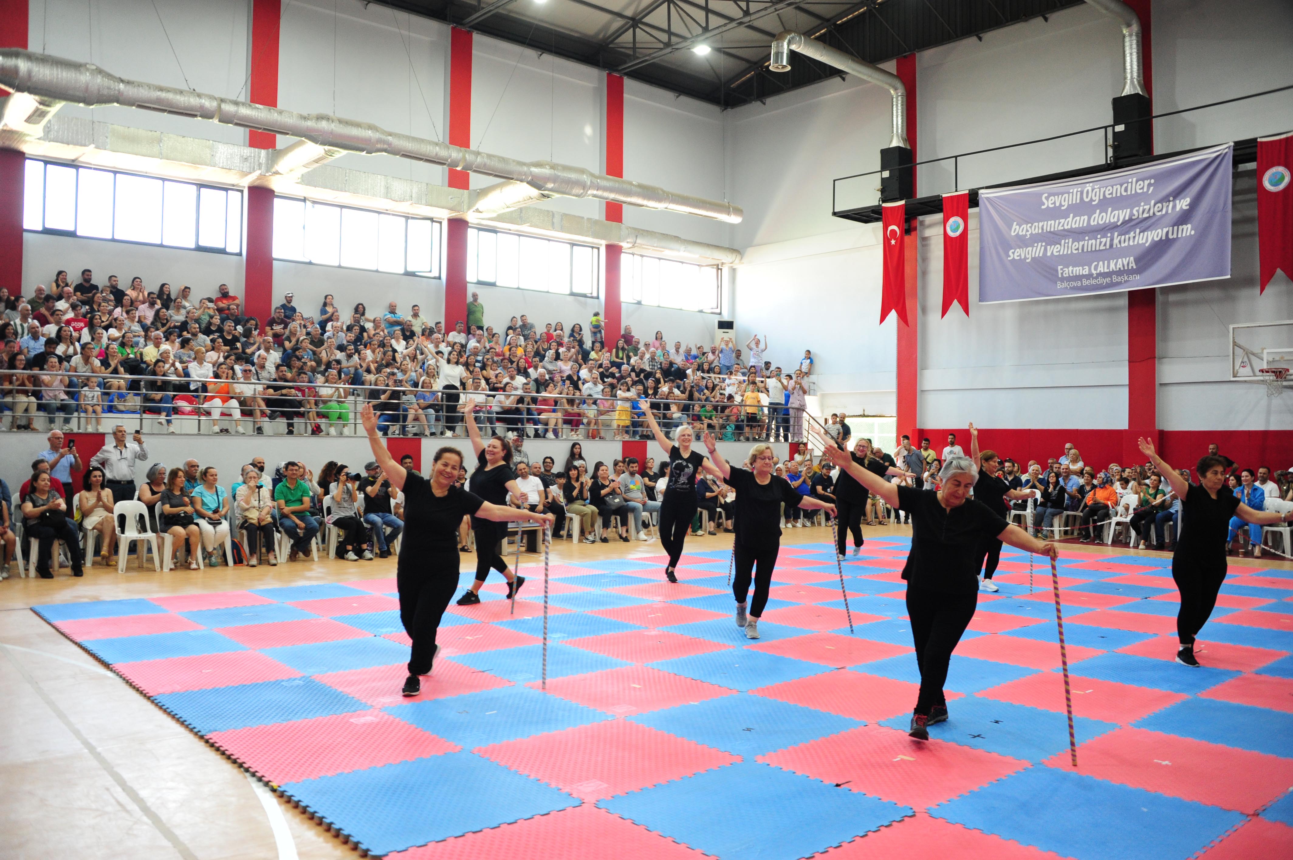 Balçova Belediyesinin “7’den 70’e herkese ücretsiz spor” sloganı her yıl binlerce kişiye verdiği spor hizmetine olan ilgi her geçen gün artıyor. Bu yıl da basketbol, futbol, voleybol, aerobik, cimnastik ve anne çocuk cimnastiği kurslarına katılan her yaştan Balçovalı, muhteşem bir yılsonu gösterisi hazırladı. Sporcuların ailelerinden oluşan kalabalık izleyici topluluğu tüm sporcuların gösterilerini hayranlıkla izledi. Gösterilerin ardından Belediye Meclis Üyesi Yalçın Karayılan ve Spor Okulu öğretmenleri sporculara katılım belgelerini verdi.