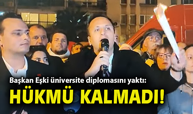 Bornova Belediye Başkanı Ömer Eşki, İBB Başkanı Ekrem İmamoğlu’nun diplomasının iptal edilmesi üzerine "Ekrem Başkan'ın diplomasını iptal ettilerse, hiçbir diplomanın hükmü kalmamıştır” dedi ve üniversite diplomasını yaktı.