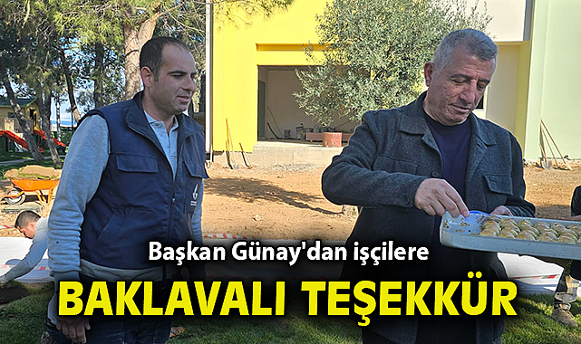 Başkan Günay, Güzelbahçe Belediyesi Park Bahçeler, Fen İşleri ve Temizlik İşleri personelini sahada ziyaret ederek projelerin hızla gerçekleşmesi için canla başla çalışan işçilere tek tek teşekkür ederek elleriyle baklava ikram etti. ‘Çalışanlarımızla yan yana, omuz omuzayız’