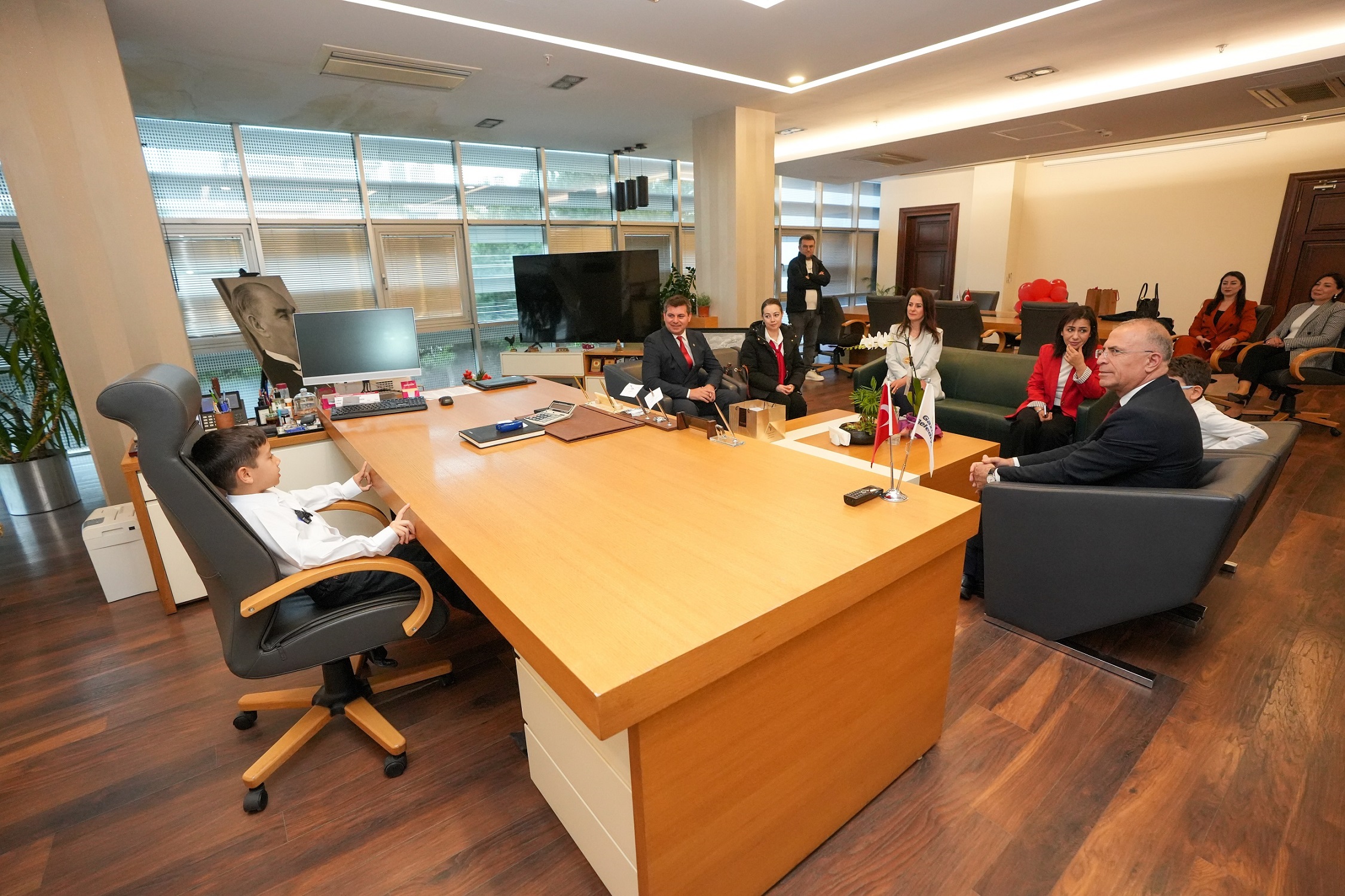 Gaziemir Belediye Başkanı Ünal Işık, 23 Nisan Ulusal Egemenlik ve Çocuk Bayramı’nda koltuğunu ilkokul ikinci sınıf öğrencisi Ege Ersöz’e devretti. İTÜ Geliştirme Vakfı Okulları öğrencisi Ege Ersöz, başkanlık koltuğuna oturduğu temsili görevinde Gaziemir’e dair hayallerini ve projelerini paylaştı. Çevrenin korunmasından kuraklıkla mücadeleye, güvenli park alanlarından kütüphanelere, spor tesislerinden sokak hayvanlarının korunmasına kadar birçok konuda fikirlerini dile getiren minik başkan, daha yeşil bir kent için ağaçlandırma çalışmalarının artırılması yönünde talimat verdi.
