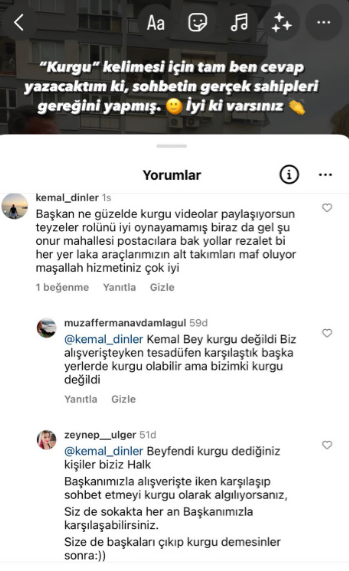 Sohbetin gerçek sahipleri olan kadınlar, eleştirilere karşı çıkarak, "Biz halkız ve her an sokakta başkanımızla karşılaşıp sohbet edebiliyoruz. Siz de başkanımızla karşılaşabilirsiniz" yanıtını verdi.Başkan Sandal, sosyal medya paylaşımındaki "Kurgu" eleştirisine atıfta bulunarak, "Tam ben cevap yazacaktım ki, sohbetin gerçek sahipleri gereğini yapmış. İyi ki varsınız" dedi.