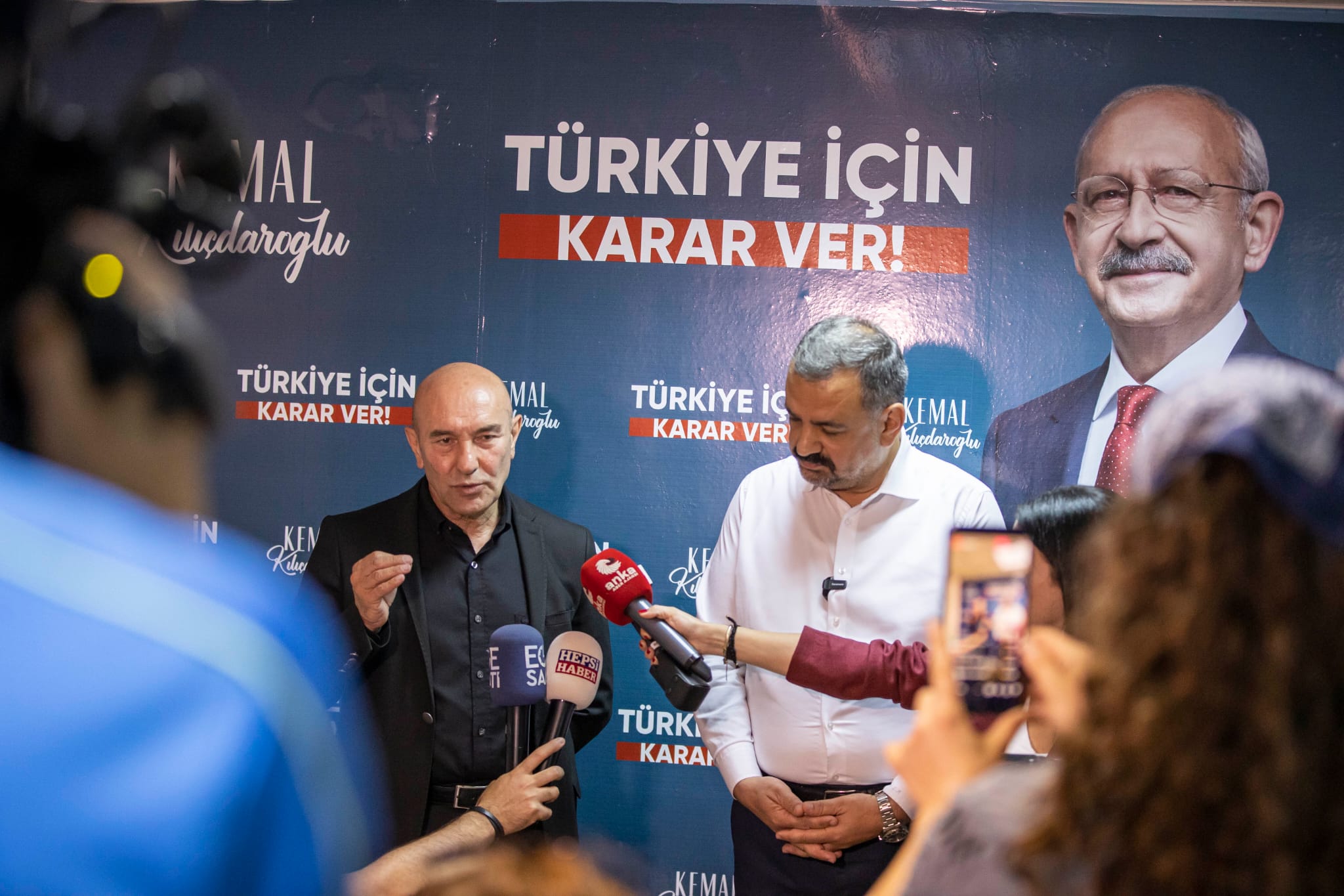 İzmir Büyükşehir Belediye Başkanı Tunç Soyer, sandıkların kapanmasının ardından seçim sonuçlarını takip etmek için CHP'nin Çankaya'da bulunan Seçim Koordinasyon Merkezi'ne geldi. CHP İzmir İl Başkanı Şenol Aslanoğlu ve çocukları Ada ve Berfin Aslanoğlu, CHP Genel Başkan Yardımcısı ve İzmir Milletvekili Yüksel Taşkın, kızı Defne Soyer, partililer ve yurttaşlarla seçim sonuçlarını takip eden Başkan Tunç Soyer, burada basın açıklaması da yaptı. Seçimin henüz bitmediğini belirterek, sandık görevlilerine seslenen Soyer, “Sandık başında olan arkadaşlarımızın görevi henüz bitmedi. Belki de aslında şimdi başlıyor. Son ana kadar, ıslak imzalı tutanaklar tamamlanıp gerekli yerlere ulaştırılana kadar arkadaşlarımız görevlerinin başında olacak” dedi.