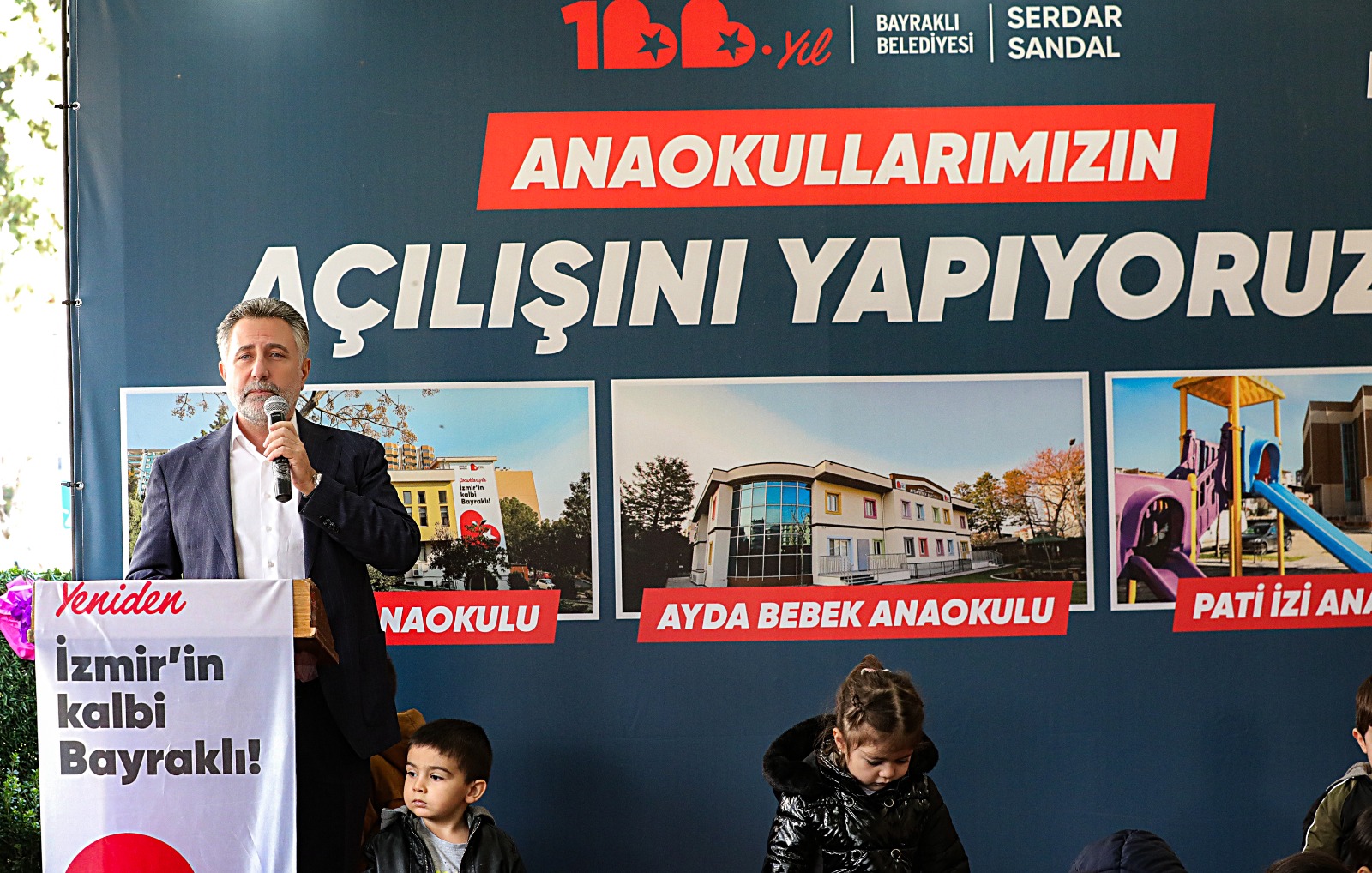 3’Ü AÇILDI, 3 ANAOKULU DA YOLDABayraklı’daki eğitim yatırımları, inşa edilen okul öncesi eğitim kurumları ve öğrencilerinin başarılarıyla fark yaratan Bayraklı Belediyesi, inşasını tamamlayarak hizmete sunduğu 3 anaokulunun açılışını yaptı. 2 anaokulunun yapımına devam edildiği bir anaokulunun da yakın zamanda temelinin atılacağı belirtildi. 75’inci Yıl Mahallesi’ndeki Elif Bebek Anaokulu bahçesinde düzenlenen açılış törenine Başkan Serdar Sandal’ın yanı sıra CHP Bayraklı İlçe Başkanı Didem Gültekin, meclis üyeleri, muhtarlar, sivil toplum örgütlerinin temsilcileri, öğrenciler, veliler ve vatandaşlar katıldı. Başkan Sandal, açılış kurdelesini katılımcılar ve çocuklarla birlikte kesti.