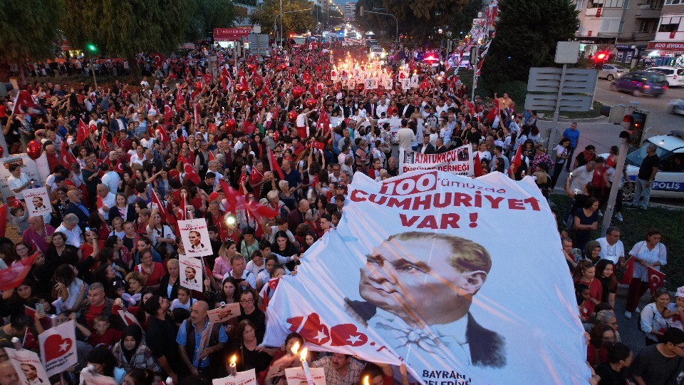 Bayraklı Belediyesi tarafından Cumhuriyet’in 100’üncü yıl kutlamaları kapsamında düzenlenen yürüyüş Özkanlar Migros önünden başladı. On binin üzerinde vatandaş, ellerinde bayraklar ve meşalelerle yürüdü. Başkan Serdar Sandal korteje eşi Aylin Sandal ve oğlu Yağız Sandal ile birlikte katıldı. CHP İzmir İl Başkanı Şenol Aslanoğlu, İlçe Başkanı Didem Gültekin, meclis üyeleri ve muhtarlar da kortejde yer aldı. Yürüyüş boyunca bando eşliğinde marşlar çalındı. Bayraklılılar, balkonlarından bayraklar sallayarak coşkuya ortak oldu.