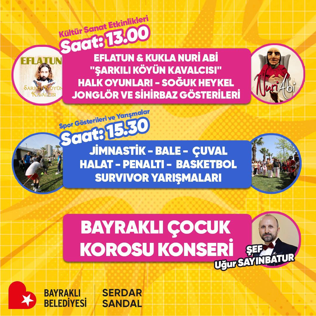 PAZAR GÜNÜ BAYRAKLI SAHİLİNDE BULUŞALIMBayraklı Belediye Başkanı Serdar Sandal, “23 Nisan coşkusunu hafta boyunca ilçemizin sokaklarında yaşadık. Çocuklarımızın heyecanına, mutluluğuna ortak olduk. Şimdi daha büyük bir programla 23 Nisan Ulusal Egemenlik ve Çocuk Bayramı kutlamalarımızı taçlandıracağız. Bu kapsamda tüm çocuklarımızı ve ailelerini 23 Nisan Pazar günü Bayraklı sahiline bekliyoruz” dedi.