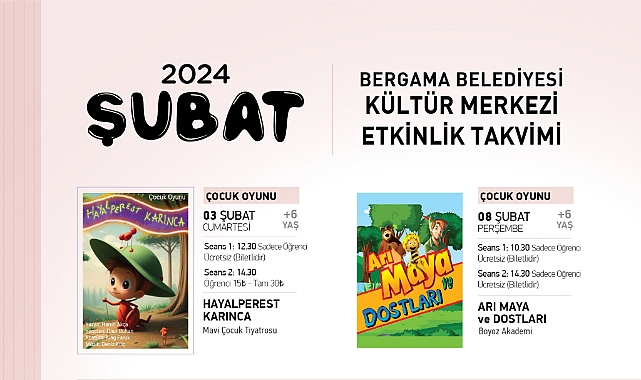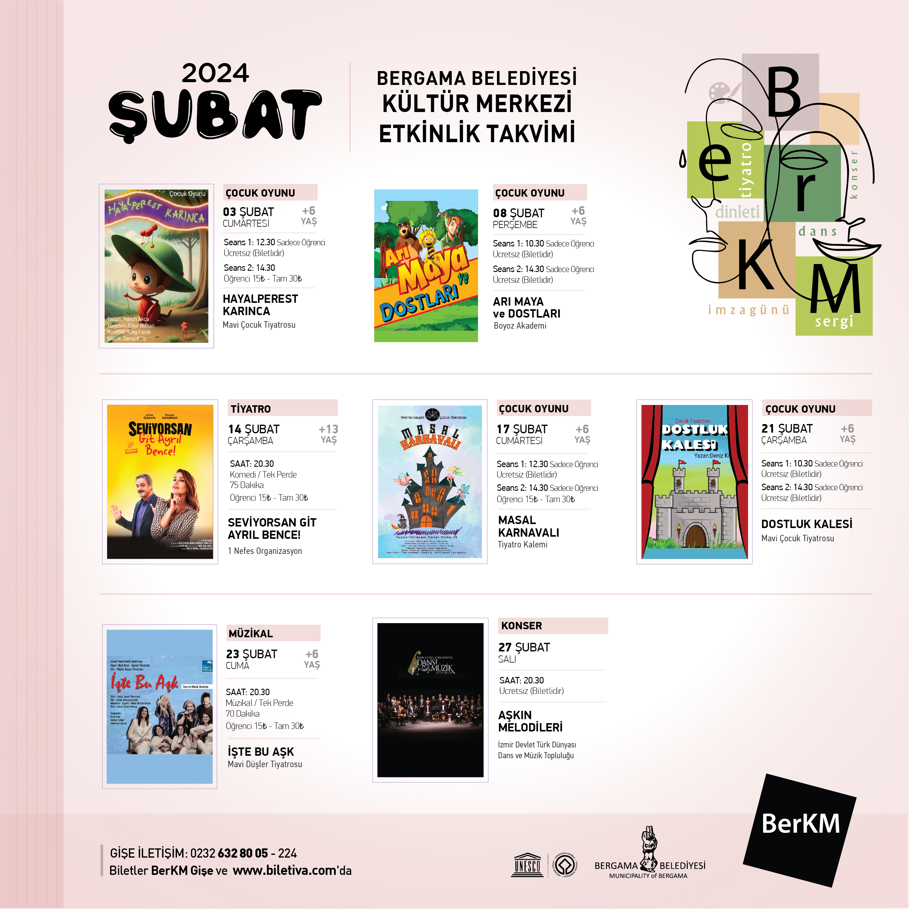 3 Şubat’ta çocuk tiyatrosu ile başlayacak etkinliklerde, Mavi Çocuk Tiyatrosu’nun sahneleyeceği “Hayalperest Karınca” oyunu 2 seans sahne alacak. 8 Şubat’ta Boyoz Akademi’nin “Arı Maya ve Dostları” oyunu sadece öğrencilere özel ücretsiz olarak Bergama Kültür Merkezi’nde gösterime girecek. 14 Şubat Sevgililer Günü’nde ise Ufuk Özkan ve Rojda Demirer’in sahneleyeceği “Seviyorsan Git Ayrıl Bence” oyunu tiyatro severlerle buluşacak. Komedi türünde sahnelenecek tiyatro tek perde oynanacak.Tiyatro Kalemi’nin sahneleyeceği “Masal Karnavalı” çocuk oyunu 17 Şubat Cumartesi 12.30 ve 14.30 olmak üzere 2 seans sahne alacak. 21 Şubat’ta ise Bergama Kültür Merkezi sahnesi yine çocuklarımız için açılacak. Sadece öğrencilere sahnelenecek “Dostluk Kalesi” ücretsiz, biletli ve 2 seans gösterime girecek.23 Şubat’a geldiğimizde “İşte Bu Aşk” müzikali tek perde olarak sahne alacak. Sanat yönetmeliğini Nazlı Kayı’nın yaptığı müzikalde Söz ve Müzik Aysun Timurcan yapıyor.Her ay en az bir konserin gerçekleştiği Bergama Belediyesi Kültür Merkezi’nde 27 Şubat’ta İzmir Devlet Türk Dünyası Dans ve Müzik Topluluğu “Aşkın Melodileri” sahne alacak. Ücretsiz olacak konser müzikseverlerle buluşacak.