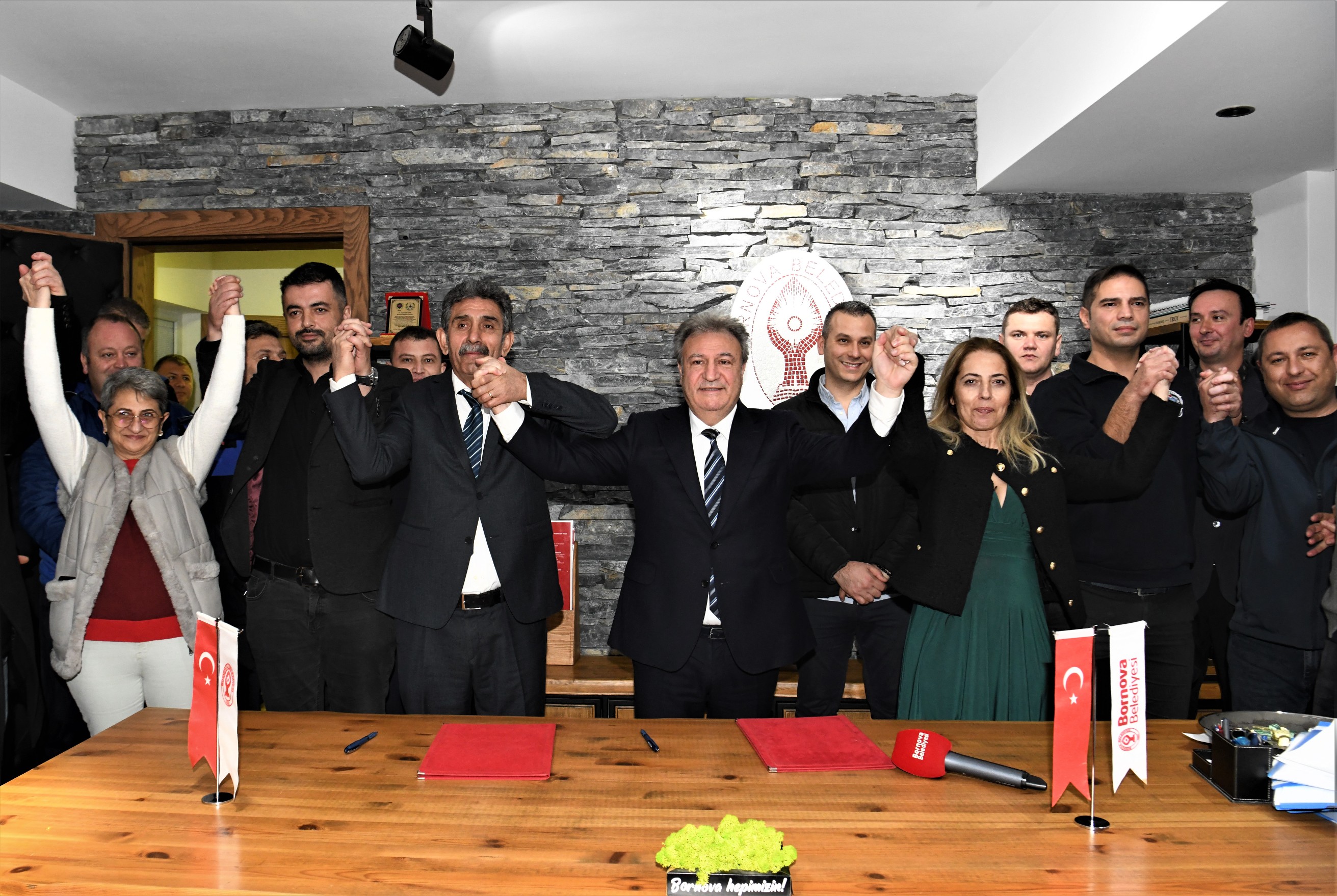 Bornova Belediye Başkanı Dr. Mustafa İduğ, DİSK’e bağlı Genel-İş Sendikası İzmir 7 No’lu Şube Başkanı Özgür Genç ile 1600 işçiyi kapsayan toplu iş sözleşmesini imzaladı. Yürürlükte olan ve 30 Haziran 2024’te sona erecek olan toplu iş sözleşmesine ek olarak imzalanan sözleşme kapsamında çalışanlarından tüm haklarında yüzde 43 oranında artış sağlandı. Yemek ücreti ise istisna üst sınırı net tutarında arttırıldı.İki sendikayla toplu iş sözleşmesi imzalandıBornova Belediye Başkanı Dr. Mustafa İduğ, Bornova Belediyesi’nde görevli 318 memur ve sözleşmeli memuru kapsayan toplu iş sözleşmesini ise Tüm-Bel-Sen İzmir 2 No’lu Şube Başkanı Nihat Filiz ve yönetim kurulu üyeleri ile birlikte imzaladı. 1 Nisan 2024’e kadar geçerli olacak üç aylık toplu iş sözleşmesi kapsamında sosyal denge tazminatı yüzde 57.45 oranında arttırıldı.“Anlayışımız çalışanımızı enflasyona ezdirmemek”Bornova Belediye Başkanı Dr. Mustafa İduğ, “5 Nisan 2019’dan mazbatamızı aldığımız günden, 31 Mart 2024’e kadar yapmaya çalıştığımız en önemli şey, enflasyona karşı tüm çalışma arkadaşlarımızı ezdirmeyen bir anlayışa sahip olmamızdır. Bunu devam ettireceğiz” dedi.Başkan İduğ: Hayırlı olsunEkonomideki gelişmeler nedeniyle ve toplu iş sözleşmesinde yaptığımız anlaşmalar gereği 2024 yılı ile ilgili, tüm çalışma arkadaşlarımızın maaşlarını iyileştirecek toplu iş sözleşmelerinin imzalarını attık. Hem memur arkadaşlarımızın hem de Bornova belediyesi Personel AŞ’deki yaklaşık 2000 çalışma arkadaşlarımızın ilgilendiren toplu iş sözleşmesi imzalarını arka arkaya atmış olduk. Tüm çalışma arkadaşlarımıza hayırlı olmasını temenni ediyorum” diye konuştu.Özgür Genç: Türkiye’ye örnekDİSK’e bağlı Genel İş Sendikası 7 No’lu Şube Başkanı Özgür Genç de 2019 yılından bugüne kadar Bornova Belediye Başkanı Dr. Mustafa İduğ ile Genel İş Sendikası arasındaki bütün toplu iş sözleşmelerinin Türkiye’ye örnek olacak şekilde imzalandığını belirterek, “Bornova Belediye Başkanımız Sayın Mustafa İduğ’a işçi arkadaşlarımıza gösterdiği özenden dolayı çok teşekkür ediyoruz” dedi.Nihat Filiz: ŞanslıyızTüm-Bel-Sen İzmir 2 No’lu Şube Başkanı Nihat Filiz ise imzaladıkları toplu iş sözleşmesinin üyeleri için hayırlı uğurlu olmasını dileyerek, “Bornova Belediye Başkanı Dr. Mustafa İduğ gibi iyi niyetli, emek ve demokrasiden yana olan bir belediye başkanıyla çalıştığımız için çok şanslıyız. Başkanımıza teşekkür ediyorum” dedi.