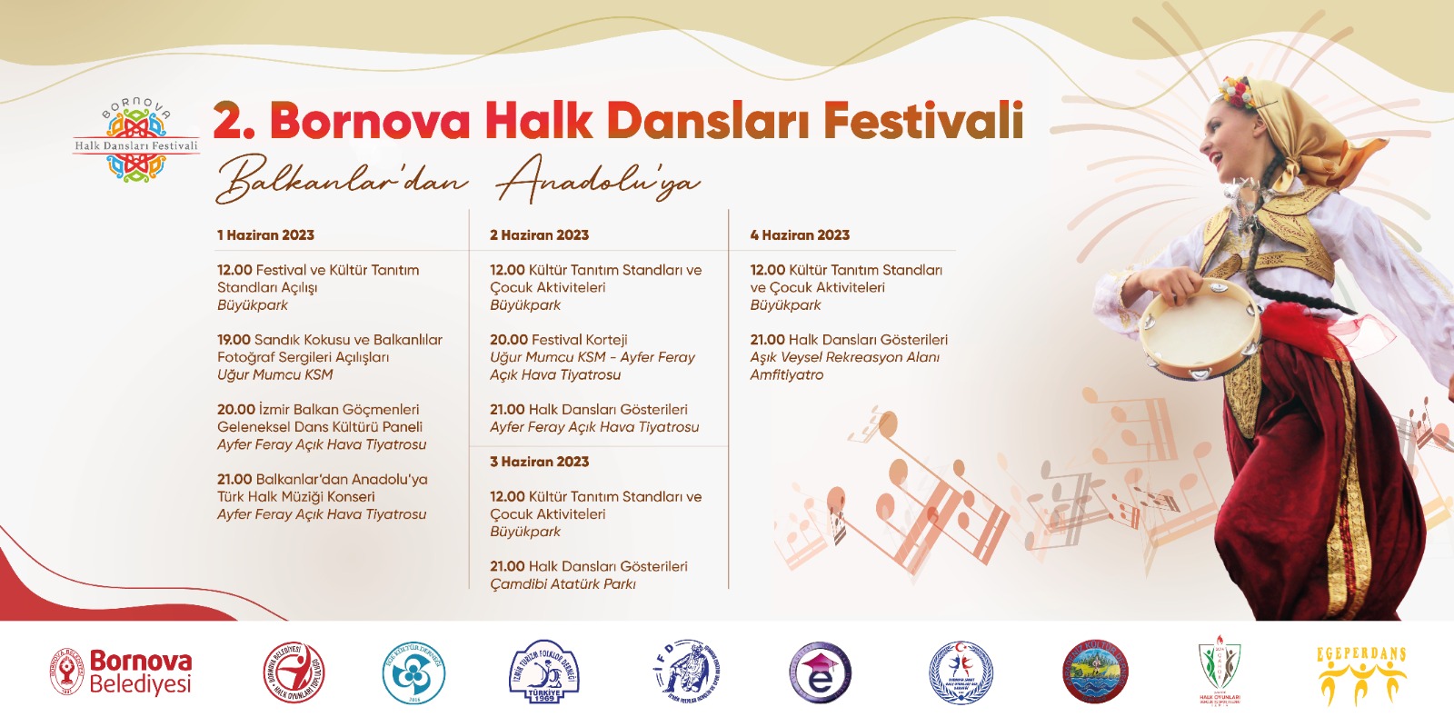 Bornova Belediyesi Halk Oyunları Topluluğu, Ege Kültür Derneği, İzmir Turizm Folklor Derneği, İzmir Folklor Derneği, Ege Üniversitesi Mezunlar Derneği, Bornova Sanat Halk Oyunları Derneği, Bornova Karadeniz Kültür Derneği, Çamdibi Balkan Halk Oyunları VE Ege Per Dans işbirliği ile hazırlanan festival, 1 Haziran Perşembe günü günü saat 12:00’de Büyükpark'ta Kültür Standları açılışıyla başlayacak. Standlar festival boyunca açık kalırken, Saat 19:00’da Uğur Mumcu Kültür ve Sanat Merkezi Halk Oyunları Gösterileri ve ‘Sandık Kokusu’ ile “Balkanlar Fotoğraf Sergisine ev sahipliği yapacak. Saat 20:00’de “İzmir Balkan Göçmenleri Geleneksel Dans Kültürü” Paneli, saat 21:00’de ise ‘Balkanlar’dan Anadolu’ya Türk Halk Müziği Konseri’ Ayfer Feray Açıkhava Tiyatrosu’nda gerçekleşecek.