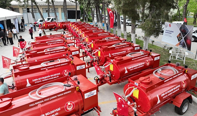 Yangınla mücadele filosu büyüyor 30 milyon liralık yatırımla alınan 125 yangın tankeri ile birlikte İzmir Büyükşehir Belediyesi’nin orman köylerine dağıttığı yangın tankeri sayısı 585’e çıkacak. Yangın tankerleri itfaiye araçları gelene kadar ulaşımın zor olduğu bölgelerde, ormanlık alanlarda yangınların başlangıç aşamasındayken söndürülmesini, büyümesini ve farklı yerlere sıçramasını önlüyor. İtfaiye eğer suya ihtiyaç duyarsa su takviyesi için de kullanılıyor. Alınan yangın tankerleri römork tipi yapıları sayesinde dar ve engebeli alanlarda etkin hizmet verecek. Kentin dağınık ve kırsal bölgelerinde yangınlara hızlı müdahale edilmesini sağlayacak. Yangın tankerleri, çevre dostu özellikleriyle de dikkat çekiyor. Sıvı yangın söndürme maddeleri kullanılarak çevresel zararlar en aza indirgeniyor. 85 yangın tankerinin mayıs sonuna kadar dağıtımı tamamlanacak. 104 milyon liralık yatırımla 59 hizmet aracı İzmir Büyükşehir Belediyesi Makine İkmal, Bakım Ve Onarım Dairesi Başkanlığı bünyesinde deprem, sel gibi doğal afetlerde hizmet vermek amacıyla 4 panelvan (tamir bakım aracı), 30 çift kabin kamyonet, 23 hafif ticari araç, ağır yüklerin hızlı ve güvenli bir şekilde taşınabilmesi için, arızalanan araç ve iş makinelerinin bakım ve onarımı için 2 kayar kasa kamyon alımı yapıldı.