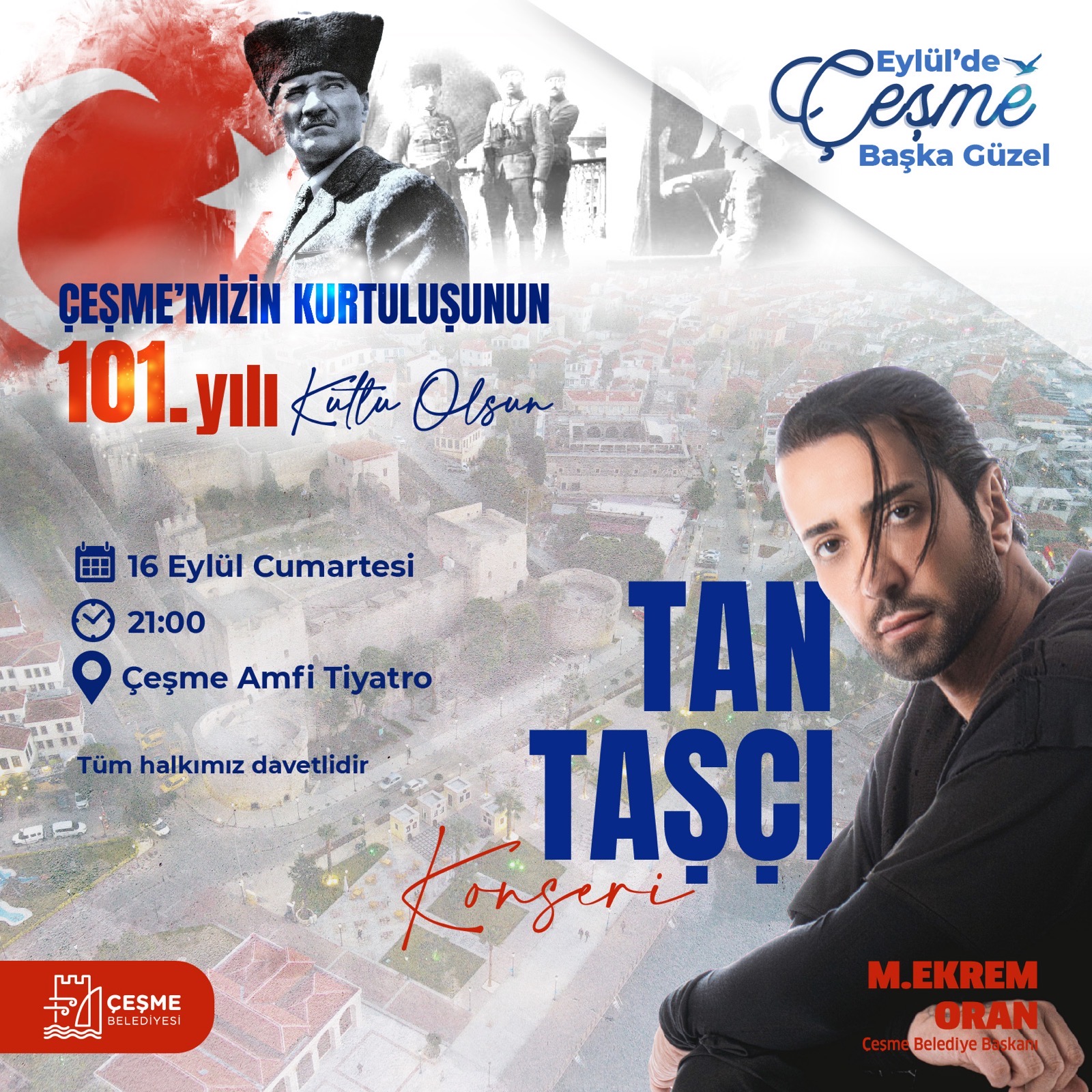 CANDAN ERÇETİN VE TAN TAŞÇI SAHNE ALACAK15 Eylül Cuma günü törenlerin ve kortejin ardından saat 21.00'de Alaçatı Amfi Tiyatro'da Türk pop müziğinin ünlü isimlerinden Candan Erçetin sahne alacak. 16 Eylül Cumartesi günü ise Çeşme Amfi Tiyatro'da Tan Taşçı ile kurtuluş coşkusu zirveye çıkacak.“AYNI GURUR VE HEYECANLA SONSUZA DEK KUTLAYACAĞIZ”Şanlı zaferin 101. yılında tüm Çeşmeliler’i bu büyük coşkuyu kutlamaya davet eden Çeşme Belediye Başkanı M. Ekrem Oran, “Ulu önderimiz Gazi Mustafa Kemal Atatürk'e, aziz şehitlerimize duyduğumuz, sonsuz saygı ve minnetimizi kelimelerle ifade edebilmemiz imkânsız. Kemalist devrimler ışığında, laik, çağdaş, tam bağımsız Türkiye Cumhuriyeti hedefimize yürüyüşümüzden asla vazgeçmeyeceğiz. Cumhuriyete ve devrimlere sahip çıkarak, kurtuluşumuzu kutlamaya dünya döndükçe devam edeceğiz. Mustafa Kemal'in izinde, bağımsızlık aşkıyla, kurtuluşumuzun coşkusu, bağımsızlık sevdamız yüzyıllar boyunca hiç dinmeyecek. Aynı gurur ve heyecanla sonsuza dek kutlamaya devam edeceğiz. Kurtuluşumuz, özgürlüğümüz, egemenliğimiz kutlu olsun” dedi.ÇEŞME FESTİVALİ “AKDENİZ” TEMASIYLA GELİYORBaşkan Oran, 1980’li ve 90’lı yıllara damgasını vuran, Çeşme Festivali’nin “Müzik & Kültür Duraklarıyla” bu yıl 21-24 Eylül tarihleri arasında gerçekleşeceğini söyledi. Büyük sürprizlerle yapılacak olan festivalin bu yılki temasının ise “Akdeniz” olduğunu sözlerine ekledi.Levent Kömür