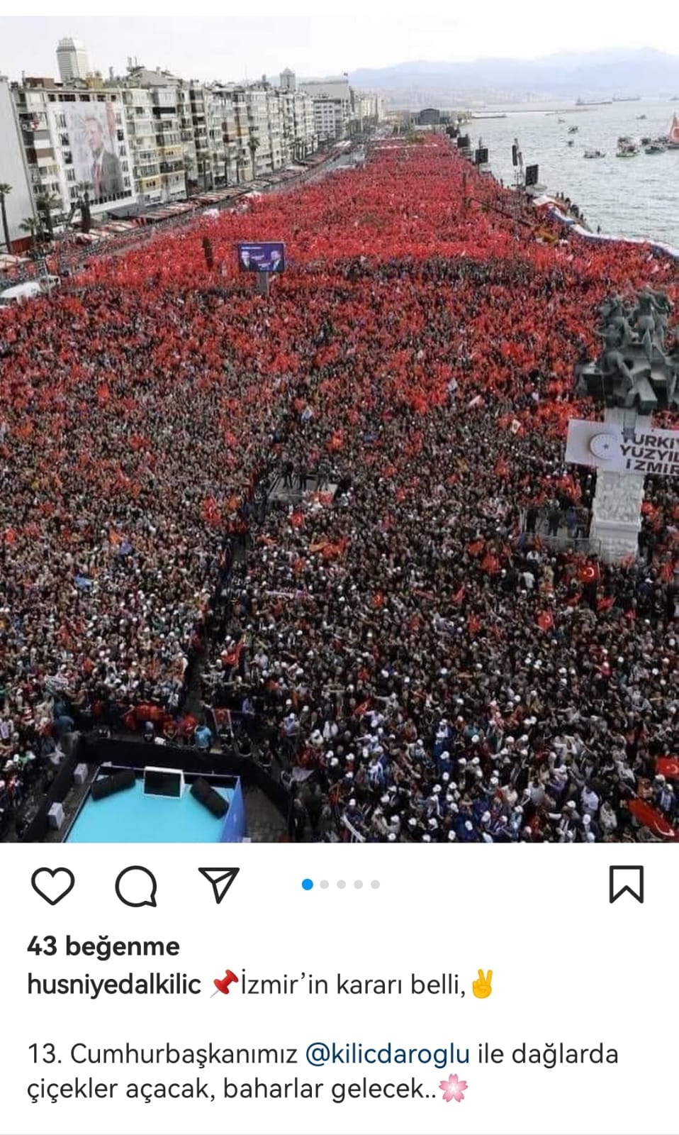 Karşıyaka Belediyesi’nin CHP’li Meclis Üyesi Hüsniye Dalkılıç, CHP Genel Başkanı Kılıçdaroğlu mitingi yerine, Cumhurbaşkanı Erdoğan’ın dün düzenlediği mitingin fotoğrafını paylaşıp, ‘’İzmir’in kararı belli’’ paylaşımında bulundu. AK Parti İzmir İl Başkan Yardımcısı Dilaver Kişili, Dalkılıç’a ‘’CHP’ye geçti ama aklı bizde kalmış!’’ yorumunda bulundu.İzmir’de, dün Cumhurbaşkanı ve AK Parti Genel Başkanı Recep Tayyip Erdoğan, Gündoğdu Meydanı’nda miting yaparken, bugün de Gündoğdu Meydanı’nın Cumhuriyet Meydanı tarafına kurulan sahne ile Millet İttifakı Adayı Kemal Kılıçdaroğlu miting düzenledi. Bir süre önce AK Parti’den CHP sıralarına geçen Karşıyaka Belediye Meclisi Üyesi Hüsniye Dalkılıç, bugün gerçekleşen Kemal Kılıçdaroğlu’nun havadan alanı gören miting fotoğrafı yerine, Cumhurbaşkanı Recep Tayyip Erdoğan’ın mitingine ait havadan alanı gören fotoğrafı paylaşıp, ‘’İzmir’in kararı belli. 13. Cumhurbaşkanımız Kemal Kılıçdaroğlu dağlarda çiçekler açacak, baharlar gelecek.’’ ifadelerini kullandı.