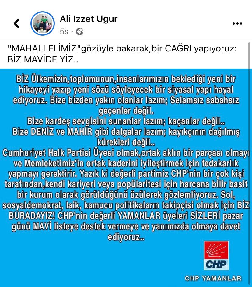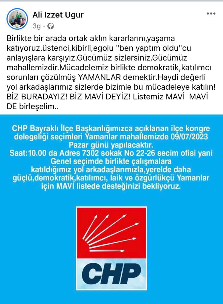AGORAMEDYA- CHP bayraklı İlçe Başkanlığı’nda adı geçen Ali İzzet Uğur Yamanlar mahallesinde Pazar günü yapılacak olan ilçe kongre delege seçimleri için sosyal medya hesabında destek çağrısında bulundu. Mavi listeye destek çağrılarını yapan Uğur paylaşımında, ‘’ ‘Mahallelimiz’ gözüyle bakarak bir çağrı yapıyoruz. Biz mavideyiz…’’ ifadelerine yer verdi.