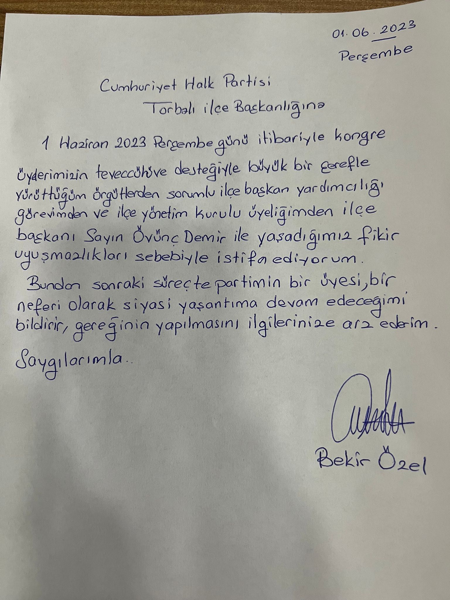 “1 Haziran 2023 Perşembe günü itibariyle kongre üyelerimizin teveccühü ve desteğiyle büyük bir şerefle yürüttüğüm örgütlerden sorumlu ilçe başkan yardımcılığı görevimden ve ilçe yönetim kurulu üyeliğimden İlçe Başkanı Sayın Övünç Demir ile yaşadığımız fikir uyuşmazlıkları sebebiyle istifa ediyorum.