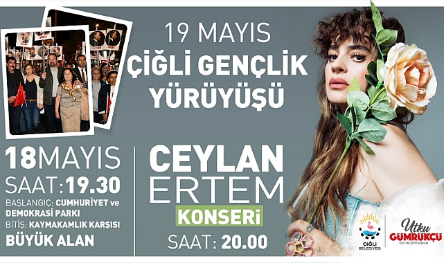 Çiğli Belediyesi'nin organize edeceği 19 mayıs Atatürk'ü Anma Gençlik ve Spor Bayramı kutlamaları 18 Mayıs Perşembe günü 19:30'da Cumhuriyet ve Demokrasi Parkı önünde Çiğli Gençlik Yürüyüşü ile başlayacak. Yürüyüşün tamamlanacağı Kaymakamlık karşısındaki büyük alanda düzenlenecek konserde alternatif rock müziğinin sevilen isimlerinden ceylan ertem sahne alacak. Başkan Gümrükçü: “Coşkuyla kutlayacağız”Tüm İzmirlileri 19 Mayıs kutlamalarına davet eden Çiğli Belediye Başkanı Utku Gümrükçü, “Ulu Önderimiz Gazi Mustafa Kemal Atatürk’ün Samsun’a çıkarak ulusal bağımsızlık mücadelemizin fitilini ateşlediği 19 Mayıs’ı her yıl olduğu gibi bu yıl da büyük bir coşkuyla kutlayacağız. 7’den 70’e her yaştan vatandaşımızın katılım göstereceği meşaleli yürüyüş düzenleyeceğiz. Yürüyüşümüzün ardından Ceylan Ertem’in birbirinden güzel şarkılarını dinleyeceğiz. İzmirli tüm vatandaşlarımızı bayraklarıyla kutlamalarımıza bekliyoruz. Bu vesileyle üzerinde yaşadığımız toprakları bizlere vatan kılan Gazi Mustafa Kemal Atatürk ve milli mücadele kahramanlarımızı bir kez daha saygı, minnet ve rahmetle anıyoruz” ifadelerini kullandı. Gamze Demircan