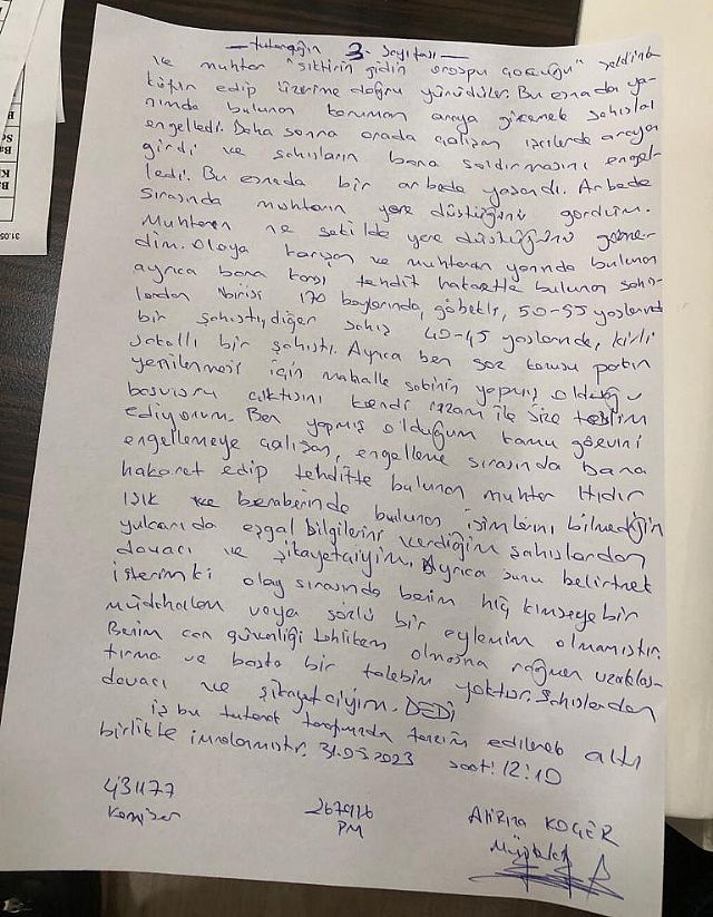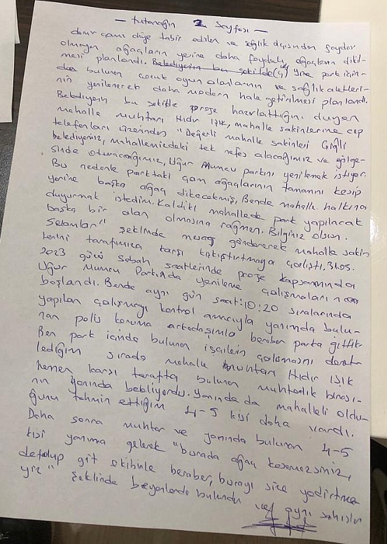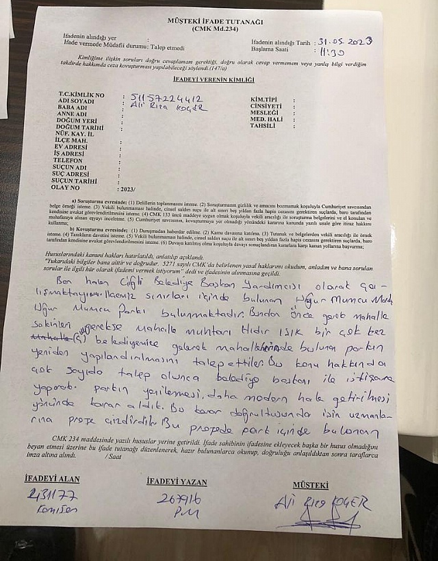 Çiğli Belediye Başkan Yardımcısı Ali Rıza Koçer, olayın ardından polise verdiği ifadede Uğur Mumcu Parkı'nın yenilenmesi ile ilgili karar aldıklarını anımsattı. Parktaki çalışmaları kontrol etmek için alana gittiğini söyleyen Koçer, burada Muhtar Hıdır Işık ile beraberindeki 4-5 kişinin üzerine yürüdüğünü söyledi. Koçer, parktaki tüm ağaçların kesileceği iddiasını yalanladı, bazı faydasız ağaçların yerine faydalı ağaçların dikileceğini söyledi. Koçer ifadesinde muhtar Işık'ın "Parktaki ağaçların tamamını kesecekmiş" diyerek mahalle halkına mesaj gönderdiğini ve yurttaşları kendilerine karşı kışkırttığını öne sürdü. Koçer'in ifadesinde, "Çalışmayı kontrol amacıyla polis koruma arkadaşımla beraber parka gittik. Muhtar Hıdır Işık hemen karşı tarafta bulunan muhtarlık binasının yanında bekliyordu. Yanında da mahalleli olduğunu tahmin ettiğim 4-5 kişi vardı. Yanıma gelerek, 'Bu ağaçları kesemezsiniz, defolup git ekibinle beraber. Size burayı yedirmeyeceğiz' şeklinde beyanda bulundu. Muhtar, "....gidin ... çocuğu şeklinde küfür edip üzerime yürüdü. O esnada arbede yaşandı. Muhtarın yere düştüğünü gördüm. Şahıslardan davacı ve şikayetçiyim" ifadeleri yer aldı. Başkan Yardımcısı Koçer'in polis ifadesinin tamamı şöyle: