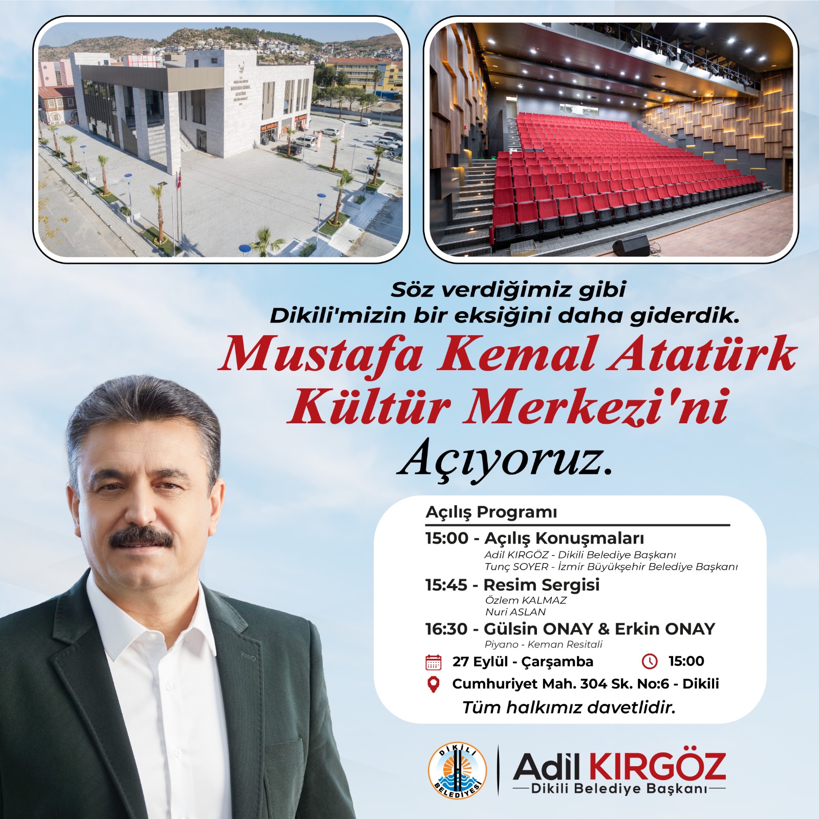 Başkan Kırgöz: “Dikili’mizde büyük bir eksikliği daha giderdik.”Göreve geldiği günden bu zamana kadar söz verdiği projelerden birini daha hayata geçirmenin mutluluğunu ve gururunu yaşayan Dikili Belediye Başkanı Adil Kırgöz, “Festivaller, kültürel ve sanatsal etkinliklerle bütünleşen ilçemizin en büyük eksikliği kültür merkezinin olmamasıydı. Cumhuriyetimizin 100. yılına yakışan Mustafa Kemal Atatürk Kültür Merkezi’mizi güzel Dikili’mize kazandırarak ilçemizdeki önemli bir eksikliği daha gidermiş olduk. Mutluyuz ve gururluyuz. Tüm vatandaşlarımızı 27 Eylül Çarşamba günü gerçekleştireceğimiz açılış programımıza davet ediyorum.” dedi.Mert Delen