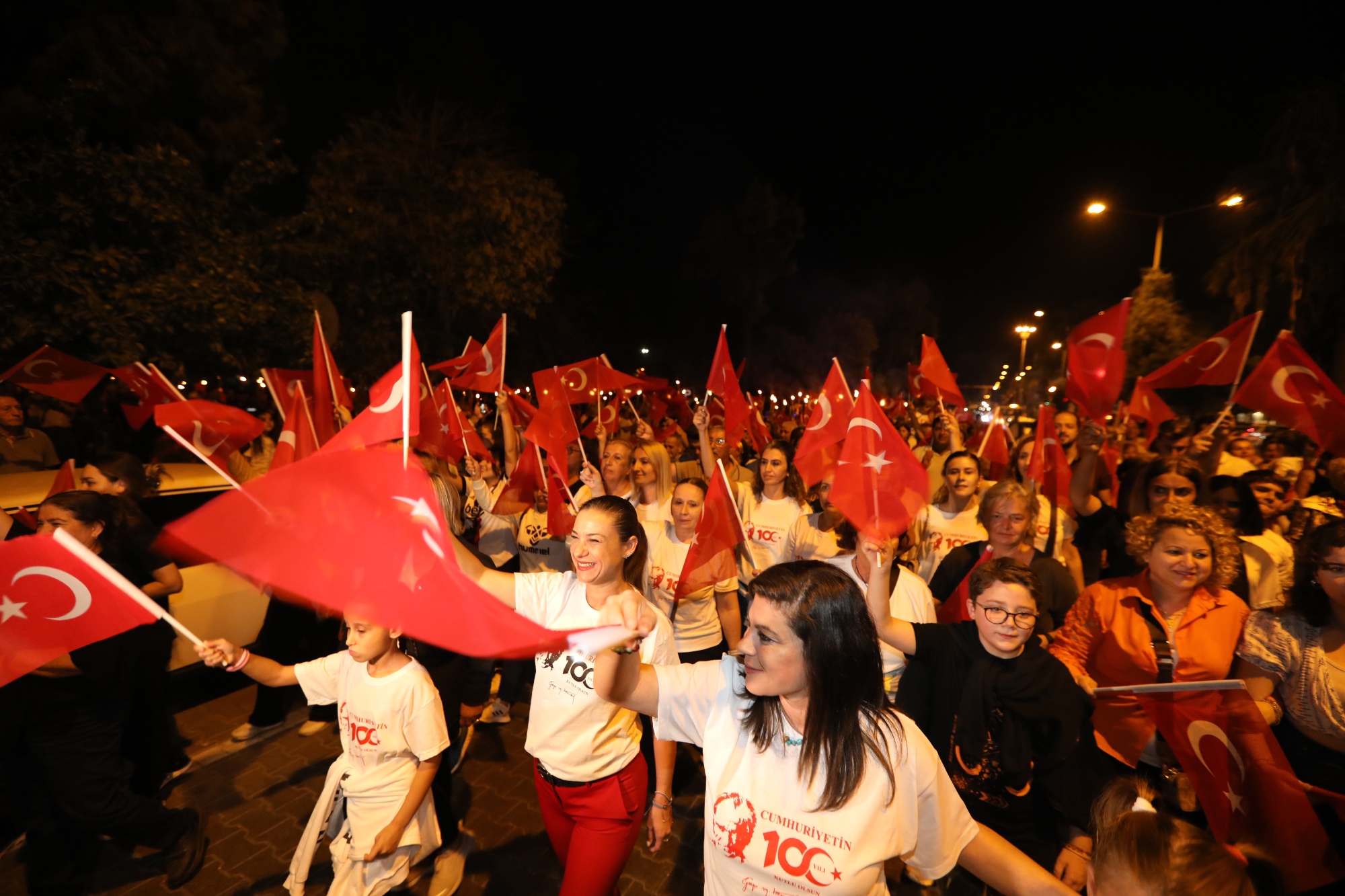 Türkiye Cumhuriyeti’nin kuruluşunun 100. yılında Efes Selçuklular Fener Alayı için saat 19.23’te Atatürk Anıtı önünde bir araya geldi. Efes Selçuk Belediyesi Gençlik Bandosu eşliğinde düzenlenen Fener Alayı’nda her yaştan Efes Selçuklu ellerinde bayraklar ve meşalelerle kent sokaklarında yürüdü. 100. yıl coşkusunu marşlarla kent sokaklarına taşıyan Fener Alayı Pazar yerinde son buldu. Pazar Yeri ana sahnede ilk olarak sahneye çıkan çocuklar “Andımız”ı okudular.