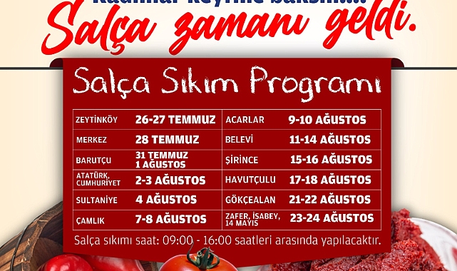 Belediye Başkanı Filiz Ceritoğlu Sengel’in projesi olan, geçmiş yıllarda kadınların memnuniyeti ile karşılanan salça makinası bu yıl da kent merkezinde ve köylerde yerini almaya hazırlanıyor.Kış hazırlıkları içinde önemli bir yer tutan salça yapımını kolaylaştıran salça makinası belirtilen tarihlerde (09.00- 16.00 saatleri arasında) köylerde ve merkez mahallelerde olacak. 26- 27 Temmuz Zeytinköy Mahallesi, 28 Temmuz Merkez, 31 Temmuz- 1 Ağustos Barutçu, 2-3 Ağustos Atatürk ve Cumhuriyet Mahalleleri, 4 Ağustos Sultaniye, 7-8 Ağustos Çamlık, 9- 10 Ağustos Acarlar, 11 ve 14 Ağustos Belevi, 15- 16 Ağustos Şirince, 17- 18 Ağustos Havutçulu, 21- 22 Ağustos Gökçealan, 23 – 24 Ağustos Zafer, İsabey ve 14 Mayıs Mahalleleriİletişim ve ayrıntılı bilgi için SELBİM’E (444 8 892 – Whats App Hattı 0533 814 33 37) ve mahalle muhtarlıklarına başvurulabilecek.Levent Kömür
