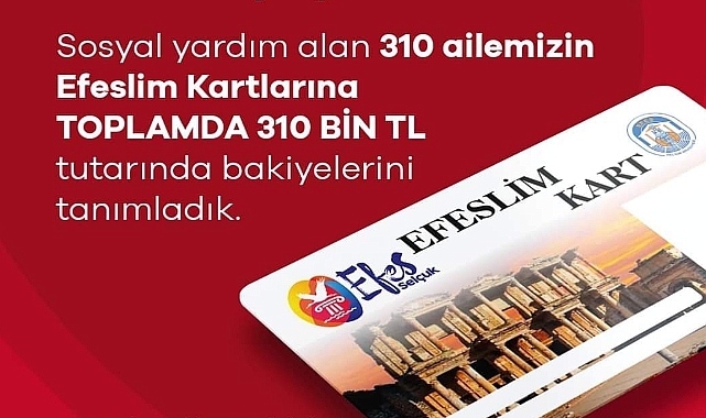 Efes Selçuk Belediyesi’nin sosyal yaşam kartı Efeslim Kart aracılığıyla sosyal destek alan 310 ailenin bakiyeleri yüzde 100 artırılarak 1000 TL olarak güncellendi. Böylece sosyal yardım alan 310 ailenin Efeslim Kartlarına toplamda 310 bin TL olarak güncellendi. Güncellenen tutar ile Efeslim Kart sahipleri anlaşmalı esnaflardan temel ihtiyaç maddelerini kartlarındaki bakiye tutarınca satın alabilecekler.