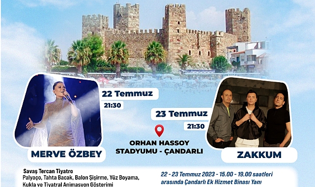 Hafta sonu Çandarlı’da düzenlenecek festival kapsamında iki gün boyunca 15.00-19.00 saatleri arasında dikili Belediyesi Çandarlı Ek Hizmet Binası yanında Savaş Tercan Tiyatrosu’nun tahta bacak, balon şişirme, yüz boyama, kukla ve tiyatral animasyon gösterimi etkinlikleri gerçekleşecek. Ayrıca aynı yerde 13.00-23.00 saatleri arasında Dikili Belediyesi Çini, Seramik, Yağcıbedir Halı Dokuma, Islak Keçe ve Dikili Fotoğraf Kulübü’nün (DİFOK) “Mavinin Ucu Çandarlı” temalı sergileri açık olacak.Festivalde “Merve Özbey” ve “Zakkum” sahne alacakÇandarlı Orhan Hassoy Stadyumu’nda gerçekleşecek olan konserlerde 22 Temmuz Cumartesi saat 21.30’da pop müziğin sevilen ismi Merve Özbey, 23 Temmuz Pazar günü aynı saatte alternatif rock grubu Zakkum hayranlarıyla buluşacak.Başkan Kırgöz: “Bu sezon da dolu dolu geçecek.”Dikili’de her dönem sosyal ve kültürel etkinliklere önem veren Belediye Başkanı Adil Kırgöz “Yaz mevsiminde Dikili’miz çok tercih edilen bir yer. Bu sezon da yoğun programlarımız olacak. İlk adımlarımızı göz bebeğimiz Çandarlı’mızda atıyoruz. Ardından 29 Temmuz-6 Ağustos tarihlerinde 2. Dikili Kitap Günleri’ne ev sahipliği yapacağız. 30,31 Ağustos-1 Eylül tarihlerinde 37. Dikili Kültür, Demokrasi ve Emek Festivali’ni gerçekleştireceğiz. Bu yaz sezonu da Dikili’mizde dolu dolu geçecek. Kuzey Ege’nin parlayan yıldızı güzel Dikili’mize herkesi bekliyoruz.” dedi. Levent Kömür
