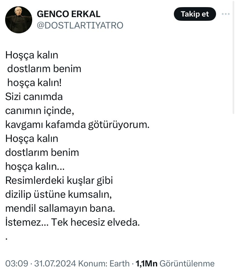 AGORA MEDYA -Usta tiyatrocu ve sinema oyuncusu Genco Erkal hayatını kaybetti. Bir süredir kan kanseri ile mücadele eden Genco Erkal, 86 yaşındaydı.Erkal’ın sosyal medya hesabından şu mesaj paylaşıldı:“Hoşça kalın dostlarım benim hoşça kalın!