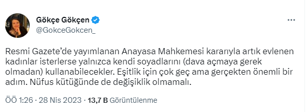 Çiğdem CANPOLAT / Kadınların evlendikten sonra eşlerinin soyadını taşıması gerektiğine ilişkin düzenleme değişti. anayasa mahkemesi (AYM), kadınların dava açmadan da sadece kendi soyadlarını taşıyabileceklerine hükmetti. Bu karar ile artık kadınlar isterse, kendi soyadlarını eşlerinin soyadlarıyla birlikte kullanmayacak, sadece kendi soyadlarıyla da evliliklerini sürdürebilecek.Bu karar sonrası sosyal medya hesabından açıklamada bulunan Cumhuriyet Halk Partisi İzmir 2. Bölge 1. Sıra milletvekili adayı Gökçe Gökçen şu ifadeleri kullandı;“Resmi Gazete’de yayımlanan Anayasa Mahkemesi kararıyla artık evlenen kadınlar isterlerse yalnızca kendi soyadlarını (dava açmaya gerek olmadan) kullanabilecekler. Eşitlik için çok geç ama gerçekten önemli bir adım. Nüfus kütüğünde de değişiklik olmamalı.”
