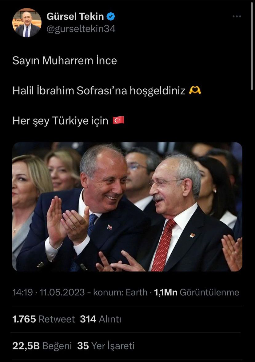 CHP İstanbul Milletvekili Gürsel Tekin, Muharrem İnce adaylıktan çekildiğini açıkladıktan sonra sosyal medya hesabında Kemal Kılıçdaroğlu ve Muharrem İnce’nin fotoğrafını paylaşarak açıklamasında şu ifadelere yer verdi: “Sayın Muharrem İnce, Halil İbrahim Sofrası’na hoşgeldiniz. Her şey Türkiye için” dedi.
