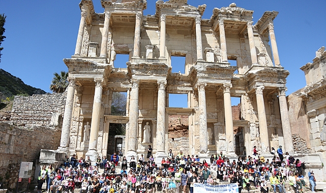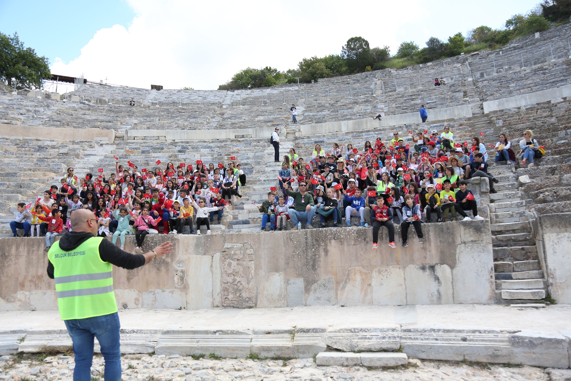 Sabahın erken saatlerinde efes selçuk belediyesi hizmet binası önünde toplanan 7- 14 yaş arası 250 çocuk Efes Antik Kenti içerisinde yer alan antik tiyatro, Liman Caddesi, Hadrian Tapınağı, Celsus Kütüphanesi gibi birçok önemli noktayı rehber eşliğinde gezdi.Gezide çocuklara Selçuk Efes Kent Belleği yayınlarından çıkan, Ayşe Zülkadiroğlu tarafından yazılan, Güven Bilge’nin çizgileriyle hayat bulan Efes Macerası kitabı hediye edildi. Renkli çizimleri ve sürükleyici öyküsü ile Efes Antik Kenti’ni anlatan kitabı inceleyen çocuklar, kitapta antik kent ile ilgili okudukları bilgileri yerinde deneyimlediler.Keşfetmenin ve öğrenmenin heyecanını yaşayan çocuklar ayrıca Celsus Kütüphanesi önünde “Dünya Çocukları Dost Olsun, Barış Getirsin” yazan bir pankart açtılar.Efes Selçuk Belediyesi tarafından kentin çocuklarına Efes Antik Kenti’ni tanıtmak amacıyla düzenlenen gezi çocukların Efes Antik Tiyatro’da söylediği İzmir Marşı ile son buldu.