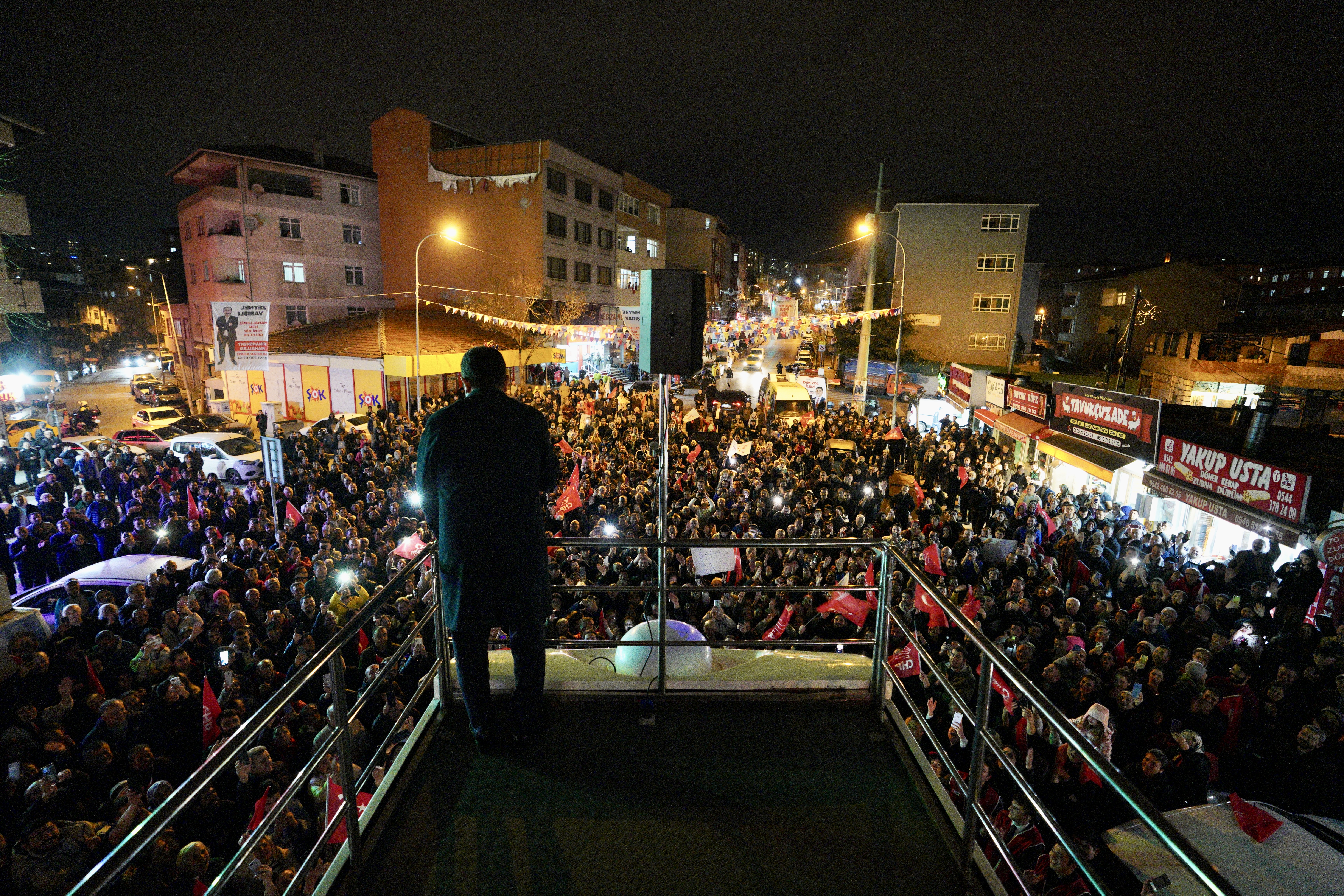 “ŞİMDİ BEN SİZE, NE YAPACAĞIMIZI SÖYLEYECEĞİM”“Şimdi ben size, ne yapacağımızı söyleyeceğim. 31 Mart'a kadar, 17+1+aday… Bu ekibe karşı topyekun, güler yüzle, hep birlikte çalışıp, komşularımızdan, akrabalarımızdan, eşimizden, dostumuzdan, telefonla arayacağınız komşunuzdan, iş arkadaşınızdan, sevgili dostum Ümraniye Belediye Başkanı adayımız, benim sevgili dostum Aykut Erdoğdu'ya Ümraniye'de oy istemeye hazır mıyız? İkincisi; şimdi biz, çok uzun zamandır birlikte siyaset yapıyoruz. Dertleşiyoruz, tartışıyoruz, fikirlerimizi çatıştırıyoruz. Niye biliyor musunuz? Doğru yolu bulmak için. Bizim birbirimizle olan anlayışımız şu şekilde. İnanılmaz deneyimli bir insan Aykut Bey, kendi mesleğinde ve eğitiminde. Benim de kendi sürecimde deneyimlerim var. Deneyimlerimizi bir araya getirip, güç birliği yapıyoruz. Ortak akıl mekanizması kuruyoruz. Onlar ne yapıyor biliyor musunuz? Gücü de yetkiyi de bir kişiye veriyorlar; Ankara'ya bakıyorlar. O ‘yap’ derse yapıyorlar, ‘yapma’ derse yapmıyorlar. ‘İmza at’ derse atıyorlar, ‘imza atma’ derse atmıyorlar. İradesi bir ortam var ediyorlar. Onlar bir kişiye bağımlı, biz, bir ekip arkadaşı olarak, milletine bağımlı insanlarız.”“17+1 VE SAYIN CUMHURBAŞKANI’NA NE DİYORUZ BİLİYOR MUSUNUZ?“Biz, İstanbul’a Ankara'dan gelen bu 17+1; yani Sayın Cumhurbaşkanı ve kabinesi + aday… Onlara ne diyoruz biliyor musunuz? Sizi ağırladık, sizi misafir ettik. 2019’da sizi, 23 Haziran'da yanlış yaptığınız için, 806 bin kez misafir ettik. Şimdi ondan daha fazla sayıda misafir ediyoruz ve sizi Ankara'ya yolluyoruz. Nereye? İşinizin başına. Gidin; enflasyonu düşürün. Doğru mu? Emekli maaşını arttırın. Doğru mu? 3600 ek göstergeyi çıkarın. Doğru mu? Peki, yetmez… ‘Mülakatı kaldıracağız’ dediniz, namus sözü verdiniz. Mülakatı kaldırın. Doğru mu? Onları görevinin başına yollayacaksınız. AK Parti'ye oy vermiş, benim kıymetli hemşehrilerim de onlara, ‘İstanbul'a gelip, Ekrem İmamoğlu ile uğraşacağınıza, gidip ekonomiyi düşürün, ekonomiyi yerine getirin’ diyecek. Onlar bile, AK Partili hemşehrilerim bile, onları kendine getirmek için, Ümraniye'de Aykut Erdoğdu Başkanıma, İstanbul’da da bu kardeşinize oy verecek göreceksiniz. Biz size, şunu vaat ediyoruz: Bu şehirde, Ümraniye'de, diğer ilçelerimizde, İstanbul'un tamamında kardeşçe bir yaşam vadediyoruz. Siz; ayrıştıranı değil, birleştireni seçeceksiniz. Siz; kutuplaştıranı değil, birbirini kucaklatmayı size göstereni seçeceksiniz. Ümraniyeliler siz; size haddini bildireni değil, haddini bilen yönetici ahlakını seçeceksiniz. Siz; kanalı değil, İstanbul'u seveni seçeceksiniz. Öyle değil mi? Öyle değil mi Ümraniyeliler? Bir soru: Kanal mı, İstanbul mu? Aynen öyle. Son olarak; onlar diyor ki tam gaz geri, biz diyoruz ki tam yol ileri.”İmamoğlu, seçim otobüsünün yolunun kesildiği Dudullu’da da vatandaşlara kısa bir konuşmayla hitap etti.Levent Kömür