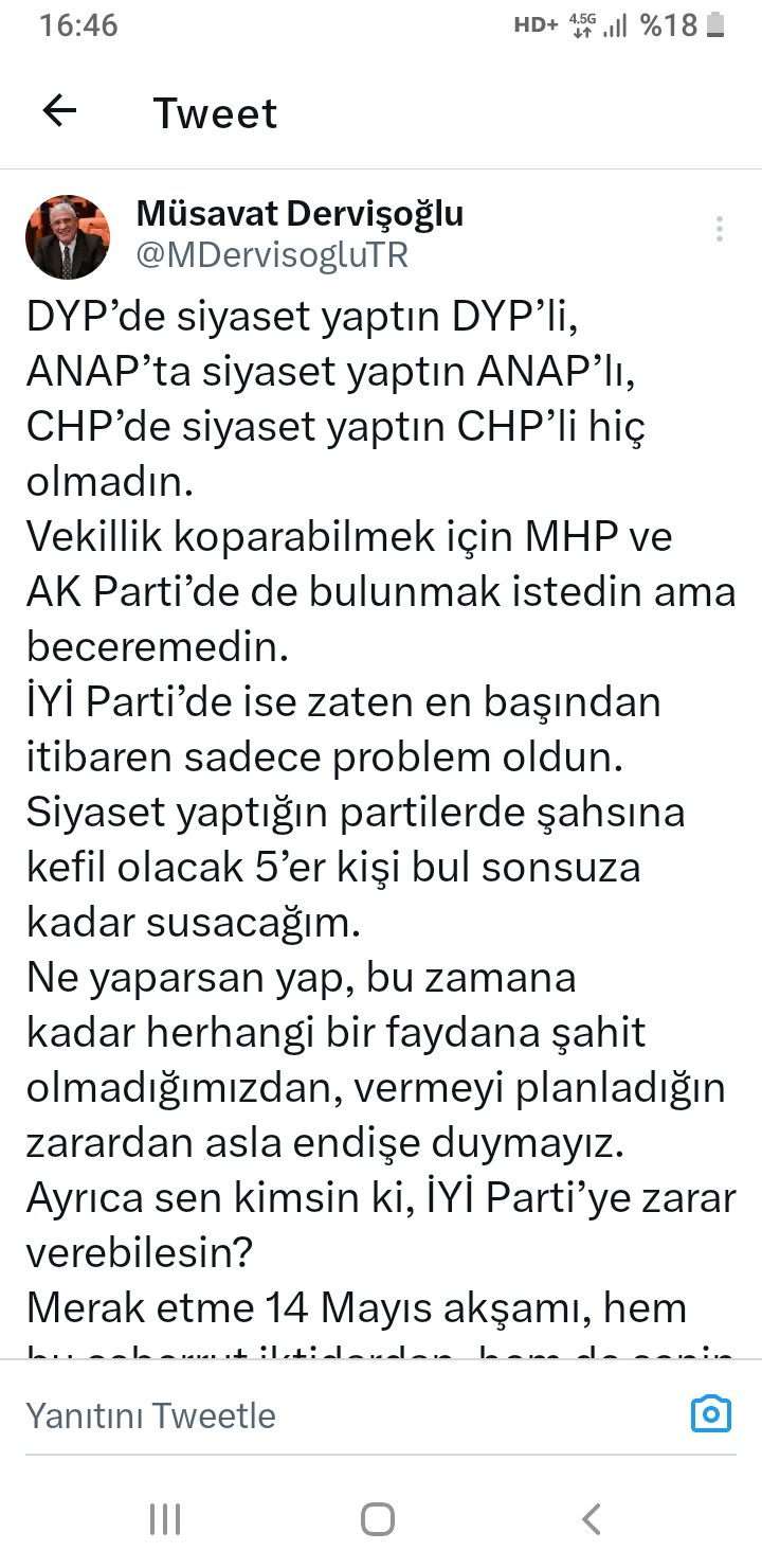 Çiğdem CANPOLAT / İYİ Parti TBMM Grup Başkanvekili müsavat dervişoğlu sosyal medya hesabından isim vermeden, Genel Başkan Başdanışmanı ve İzmir milletvekili Aytun Çıray’ı hedef aldı.Dervişoğlu yapmış olduğu paylaşımda şu ifadeleri kullandı:*DYP’de siyaset yaptın DYP’li, ANAP’ta siyaset yaptın ANAP’lı, CHP’de siyaset yaptın CHP’li hiç olmadın. Vekillik koparabilmek için MHP ve AK Parti’de de bulunmak istedin ama beceremedin.*İYİ Parti’de ise zaten en başından itibaren sadece problem oldun. Siyaset yaptığın partilerde şahsına kefil olacak beşer kişi bul sonsuza kadar susacağım.Ne yaparsan yap, bu zamana kadar herhangi bir faydana şahit olmadığımızdan, vermeyi planladığın zarardan asla endişe duymayız.Ayrıca sen kimsin ki, İYİ Parti’ye zarar verebilesin? Merak etme 14 Mayıs akşamı, hem bu ceberrut iktidardan, hem de senin gibi bir musîbetten kurtulmanın bayramını yaşayacağız."Dervişoğlu sözlerini "Merak etme 14 Mayıs akşamı, hem bu ceberrut iktidardan, hem de senin gibi bir musîbetten kurtulmanın bayramını yaşayacağız" diyerek tamamladı.