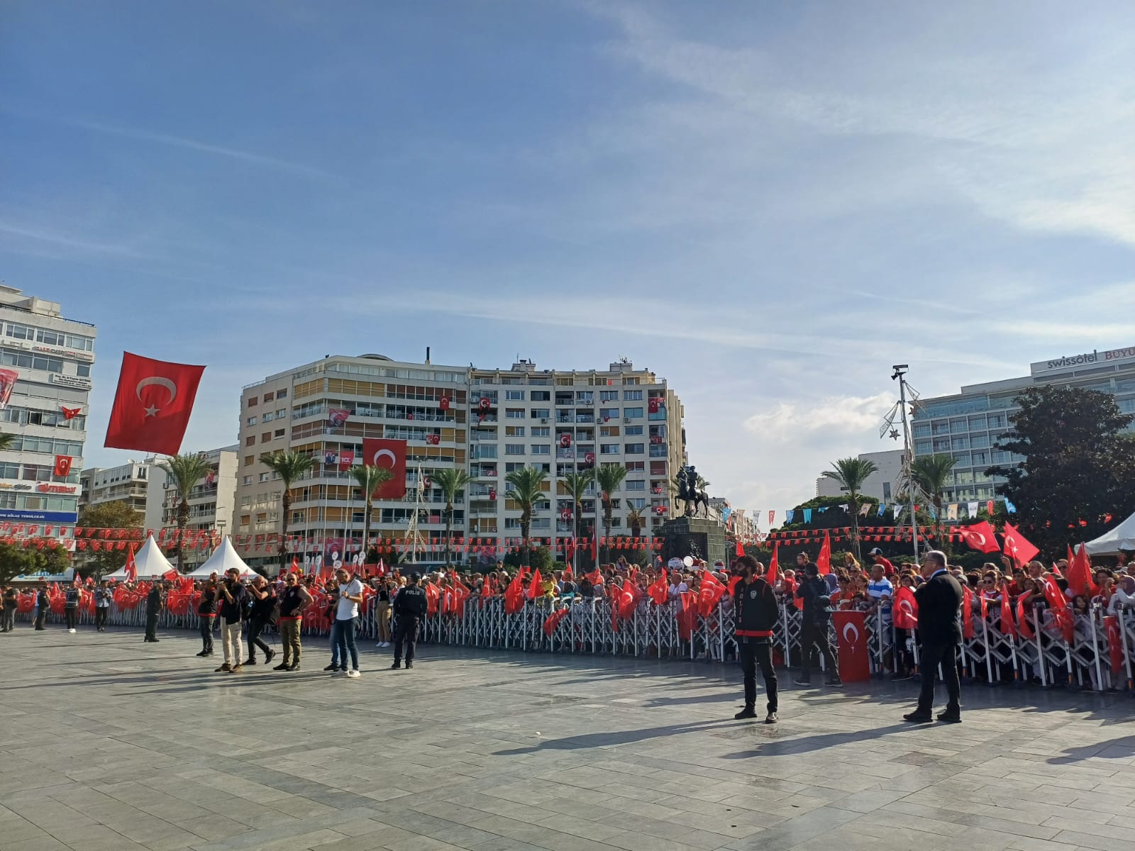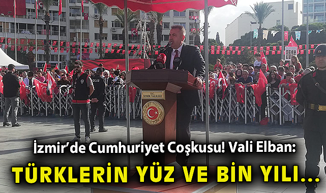 AGORAMEDYA - 29 Ekim Cumhuriyet Bayramı kutlamaları, Cumhuriyet Meydanı’nda coşkulu bir şekilde başladı. 100. yıl töreninde konuşan İzmir Valisi Süleyman Elban, Türk milletinin Kurtuluş Savaşı ile destan yazdığını, Atatürk ve silah arkadaşlarının kurduğu Türkiye Cumhuriyeti’ni, muasır medeniyetler seviyesine çıkarmak için tüm Türkiye’nin var gücüyle çabaladığını belirtti. Elban, “Cumhuriyetin kurulmasında büyük emekleri olan, canını hiçe sayan, başta Gazi Mustafa Kemal Atatürk ve silah arkadaşlarını, tüm şehitlerimizi, tüm gazilerimizi şükran ve minnetle anıyorum. Onlara ve şehitlerimize; Gözünüz arkada kalmasın, elimizden gelen her şeyi yapacağımıza emin olmalarını istiyoruz” ifadelerini kullandı.