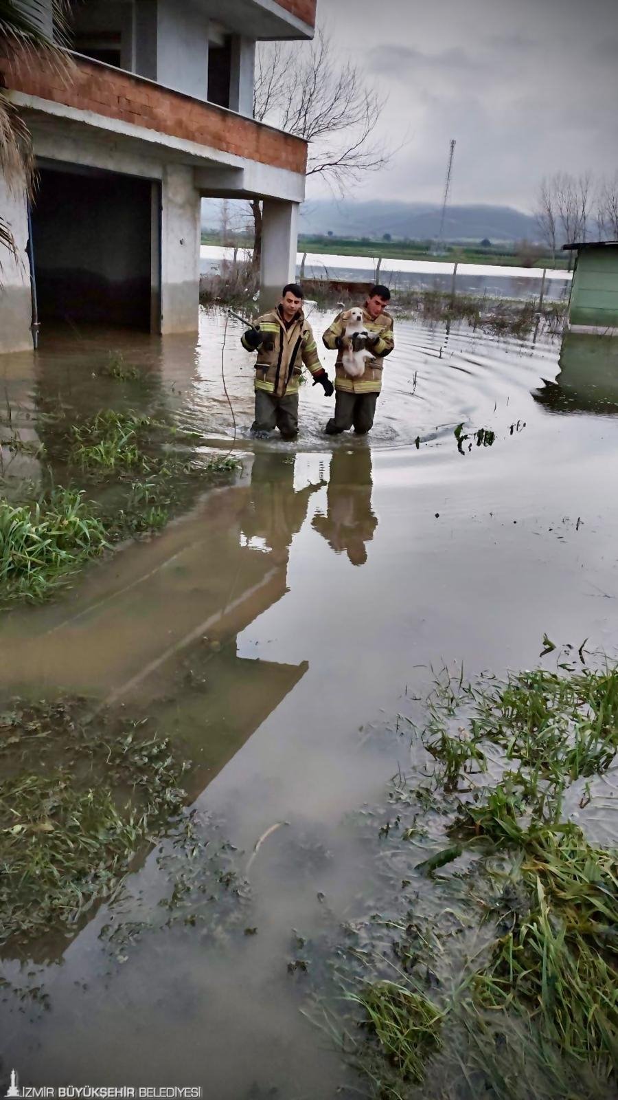 İzmir’in Torbalı ilçesine bağlı Yeniköy Mahallesi’nde, inşaat hâlindeki üç katlı bir binaya sığınan bir köpek, çevresini saran su nedeniyle mahsur kaldı. Su seviyesinin hızla yükselmesiyle kaçacak yeri kalmayan hayvan, binanın üçüncü katına sığındı. İhbar üzerine İzmir Büyükşehir Belediyesi İtfaiye Dairesi Başkanlığı ekipleri kısa sürede bölgeye ulaştı. Zamanla yarışan ekipler, yüksek su seviyesine rağmen dikkatli ve kontrollü bir çalışma yürüttü. Korku ve yalnızlık içinde bekleyen köpeğe kısa sürede ulaşıldı. İlk anda tedirginlik yaşayan hayvan, itfaiyecilerin güven verici yaklaşımı sayesinde sakinleşti. Kucaklanarak güvenli alana çıkarılan köpek yeniden özgürlüğüne kavuştu.