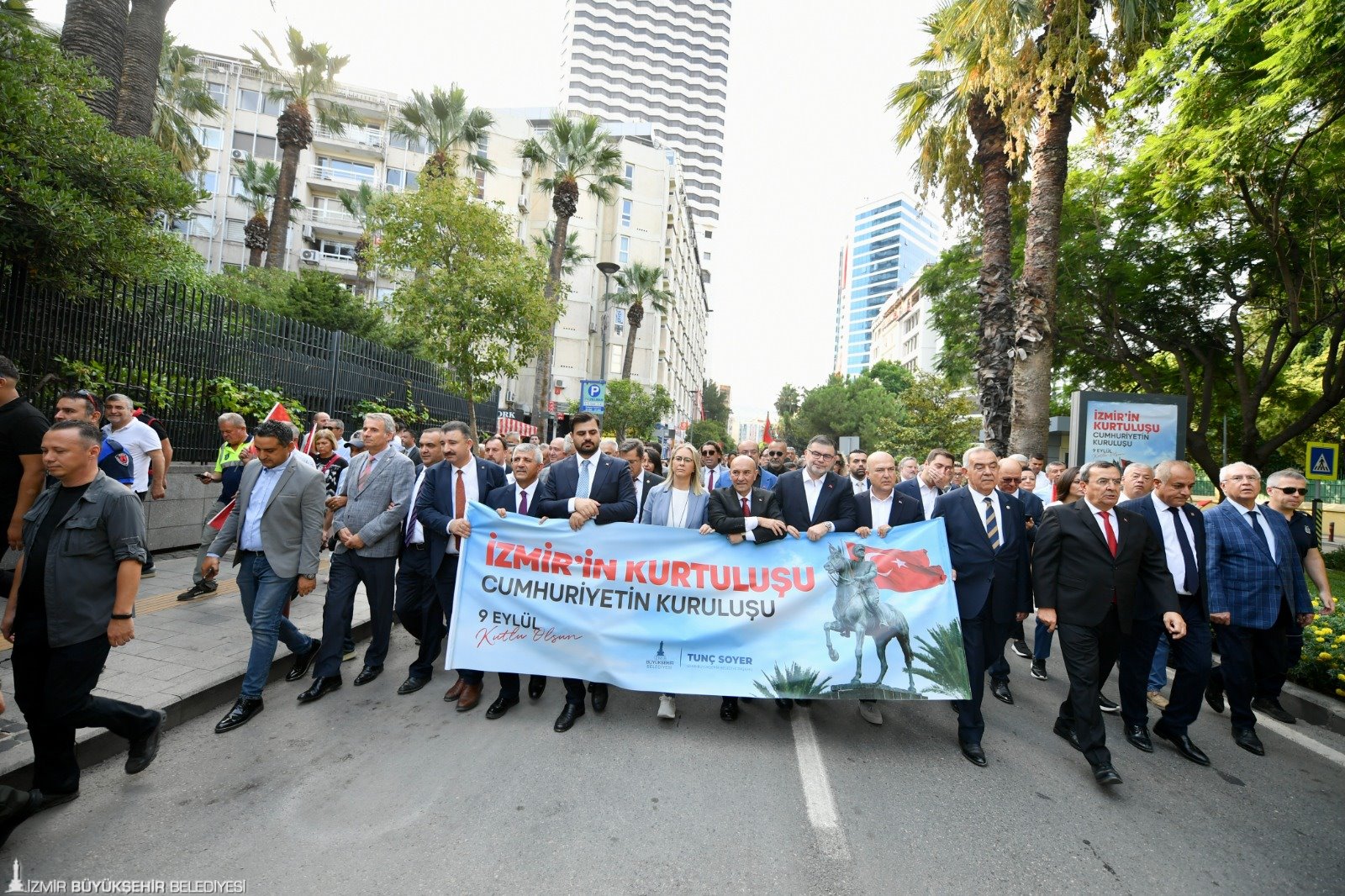 İzmir Büyükşehir Belediyesi'nin hazırladığı 350 metre uzunluğundaki Türk bayrağını taşıyan İzmirliler Gaziler, Anafartalar ve İkiçeşmelik caddeleri üzerinden Cumhuriyet Meydanı'na ulaştı. Marşlar eşliğinde ilerleyen korteje yurttaşlar da alkışlarla destek verdi. Yürüyüşte duygularını aktaran Başkan Tunç Soyer, “Çok coşkuluyuz, gururluyuz. 9 Eylül, sadece İzmir ve Türkiye için değil bütün dünya için mazlum milletlerin umut bulduğu bir gün. Savaşın zaferle, zaferin barışla taçlandığı bir gün. 100 yıldır bu topraklarda barış içinde yaşıyoruz. Kahraman şehitlerimizin ruhu şad olsun” dedi.
