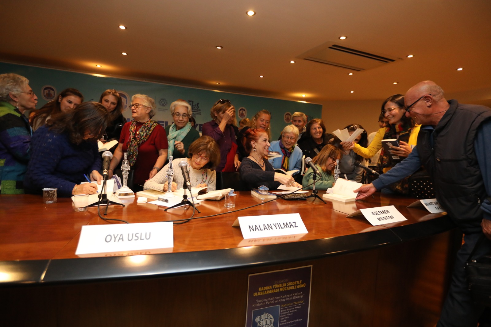 “İnadına Kadınım Kadınsın Kadınız” kitabının yazarlarından Gülseren Mungan, Oya Uslu, Nalan Yılmaz ve Buket Başaran Akkaya’nın katılımıyla gerçekleşen panelde, yazarlar kitapta yer alan deneme ve incelemeleri üzerine konuştu.Emine Onaran İncirlioğlu moderatörlüğünde gerçekleşen panelin ilk konuşmacısı olan Yazar Gülseren Mungan “Eril Dil’le Şiddet Kadında Söz İzleri” başlıklı konuşmasında kadına yönelik farklı şiddet türlerini sözlü şiddetin tetiklediğini belirterek; “Dilimize yerleşmiş, zihnimize kazılmış, kadını aşağılayan, kötüleyen, ötekileştiren, şiddete maruz kalmasını maruz gören çok sayıda yazılı, sözlü materyalimiz var. Bu yapı taşlarının toplumda oluşturduğu namus algısı ve cinsiyetçi bakış açısı tamamen kadınları kuşatmış durumdadır. Cinsiyetçi bakış açısını bir kenara bırakarak, erkekler ve kadınlar olarak bir araya gelip eril dilde şiddet ile mücadele etmeliyiz” dedi.Oya Uslu “Kadın ve Namus” başlıklı konuşmasında namus kavramının kadın üzerinden tanımlanmasına karşı bir bakış açısının geliştiğinin belirterek; “Giderek ahlak konusunda çifte standarda karşı çıkan; vicdan, onur, rıza ve merhamet gibi evrensel değerlerle namusu kadın cinselliği üzerinden tanımlamayan, kadınların özgürlüğü için mücadele eden bireyler seslerini yükseltiyor” dedi.Nalan Yılmaz “Cinsel Saldırı, Çocuğun Cinsel İstismarı ve Ensest” başlık konuşmasında çocuk istismarına karşı toplumsal duyarlılığa dikkat çekerek; “Çocuğa yönelik cinsel istismar, tespiti çok son derece zor olan bir istismar çeşidi olarak karşımıza çıkıyor. Cinsel istismar konusundaki suskunluğa son verilerek toplumun dikkati hep uyanık tutulmalıdır. Çocuklarda korku duygusu oluşturmadan, gerekirse bir uzman gözetiminde bir bilinç oluşturulmalıdır. Yetişkin bireyler gibi çocukların da istemedikleri şeylere itiraz etme hakkı olduklarını mutlaka anlatmalıyız. Çocuklara güven telkin ederek onların verdikleri bilgilere inanmalıyız” dedi.Buket Başaran Akkaya, kadına yönelik şiddete karşı kadınların tutumlarını köy ve kent hayatı, iş hayatı üzerinden örneklerle değerlendirerek; “Cinsiyet ayrımcılığı üzerine kurulu olan erkek egemen sistemde kadın sadece sistem ve onun temsilcisi erkek tarafından değil belli koşullarda hemcinsleri tarafından da ezilmektedir” dedi. Panelin ardından katılımcı yazarlar “İnadına Kadınım, Kadınsın, Kadınız” kitabını katılımcılar için imzaladılar.