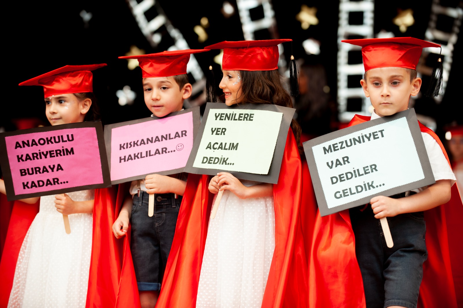 GURUR VE MUTLULUK BİR ARADAKarnaval havasındaki yıl sonu etkinliklerinde sahneye çıkan öğrenciler en sevilen film yıldızlarını, çizgi film karakterlerini, çeşitli meslek kollarını canlandırdılar. Ayrıca dans gösterileri sergileyip, şarkılar söyleyen minikler, geri dönüşüme destek vermek amacıyla atık malzemeler ile hazırlanan kostümler giyerek defile yaptılar. Mezun çocukların diplomalarını alarak kep atmasıyla sona eren törenlerde aileler de sevinç ve gururu bir arada yaşadı. Miniklerin anne-babaları, nineleri, dedeleri onları gururla izledi. İlk kez bu heyecanı tadan sevimli küçükler, bol bol alkış almanın keyfini yaşadı.“NİTELİKLİ EĞİTİMLE GELECEĞE HAZIRLIK”Tüm öğrencileri, ailelerini ve öğretmenlerini tebrik eden Karşıyaka Belediye Başkanı Dr. Cemil Tugay “En çağdaş imkanlarla ve yetkin kadrolarla donattığımız anaokullarımızda, çocuklarımızı nitelikli eğitimle geleceğe hazırlamanın mutluluğunu yaşıyoruz. Düşünen, üreten ve sorgulayan bir nesil yetiştirmek için sorumluluk alıyoruz. Geleceğimiz olan evlatlarımızı güven dolu yarınlara hazırlama bilinciyle hareket ediyoruz. Ülkesine, insanlığa, doğasına saygılı, Atatürk’ün değerlerine ve Cumhuriyet’e bağlı evlatlar yetiştirmekten gurur duyuyoruz. Geleceğin umudu ve ışığı olan her bir çocuğumuzu, ailelerini ve onları emekle yetiştiren öğretmenlerini yürekten kutluyorum. Keyifli, sağlıklı ve mutlu bir yaz tatili diliyorum” dedi.