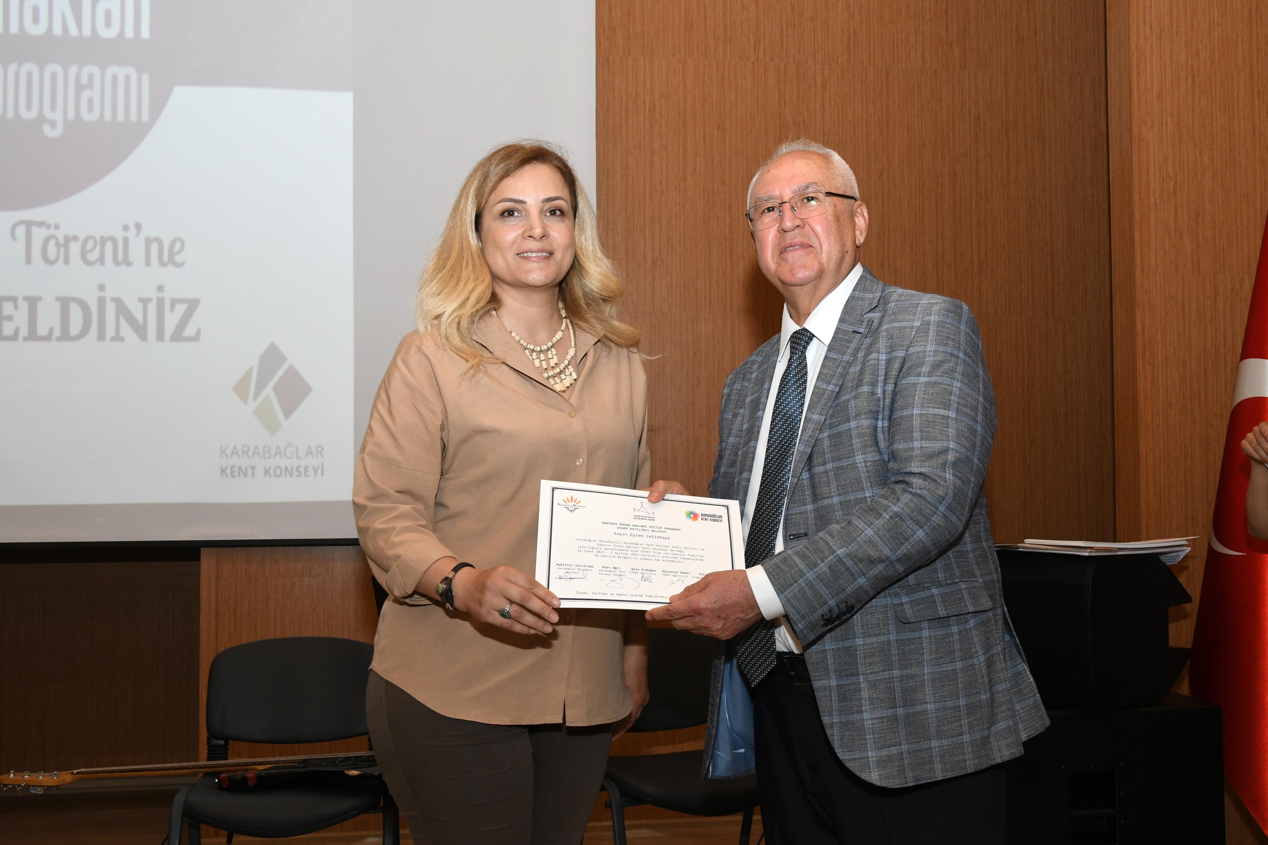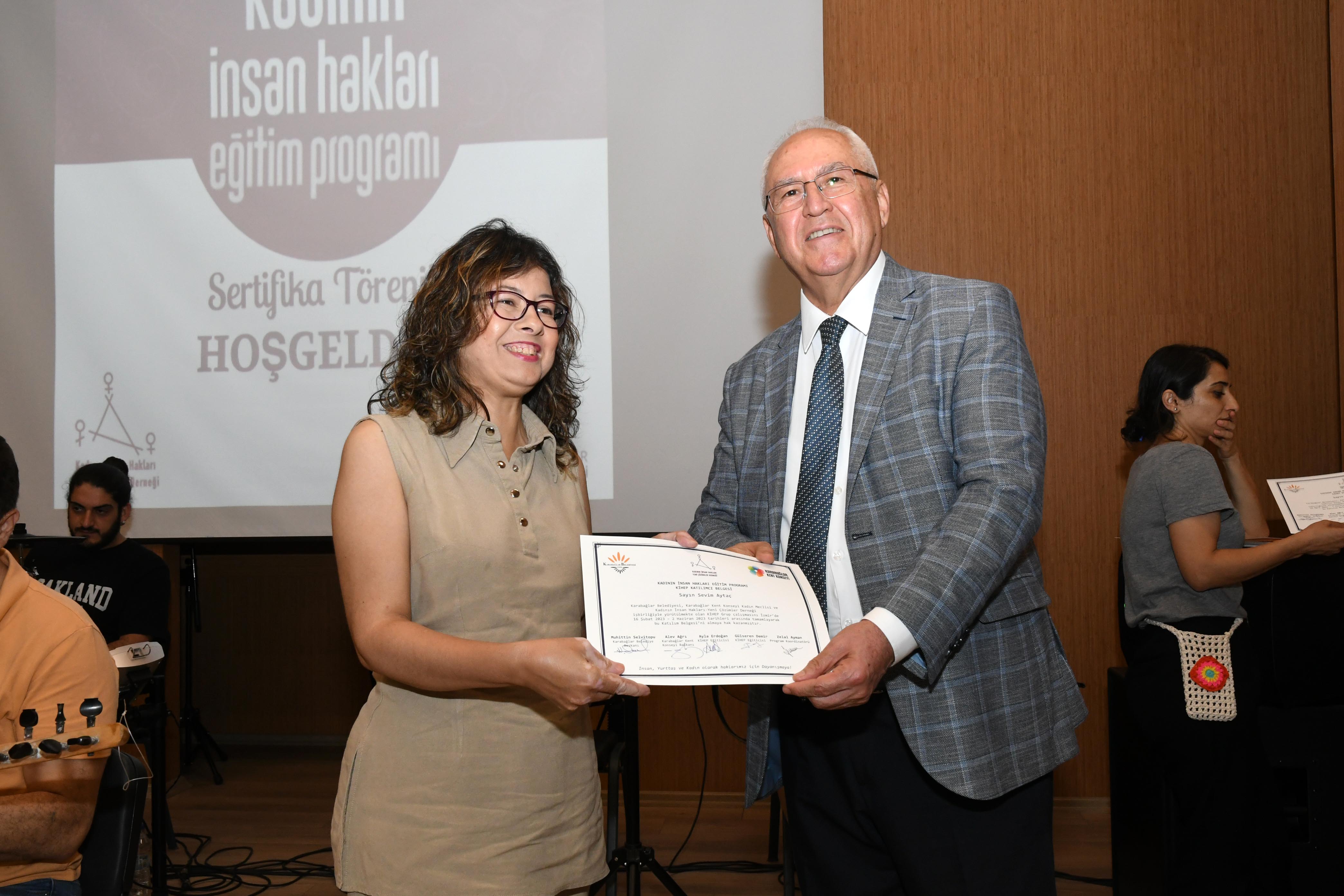 Karabağlar Belediyesi Yıldız Kenter Kültür ve Sanat Merkezi Konferans Salonu’nda gerçekleştirilen sertifika töreninde, Başkan Selvitopu’nun yanı sıra Karabağlar Kent Konseyi Başkanı Alev Ağrı, Karabağlar Kent Konseyi Önceki Dönem Başkanı Seniye Nazik Işık, Karabağlar Kent Konseyi Yürütme Kurulu üyeleri, KİHEP eğitmenleri ve kursiyerleri yer aldı. Etkinliğin açılışında konuşan Karabağlar Kent Konseyi Kadın Meclisi Başkanı Funda Özdemir, konuya duyarlılığı nedeniyle Başkan Selvitopu’na teşekkür etti ve deneyimlerini paylaştı.