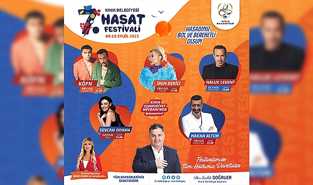 Bakırçay ovasının bereketli topraklarında yetişen ürünleri, Kınık’ın kültürel zenginliğini ve bölge insanının samimiyetini katılımcılarla buluşturmak üzere 7.’si düzenlenen Hasat Festivali kent ve köy kültürünü harmanlayan etkinliklerle bu yılda eşsiz bir deneyim yaşatacak. Ayrıca standların arasında Sma Tip-1 hastası Defne Gürbulak için de özel bir stand kurulacak. Etkinlikler kapsamında KÖFN, İrem Derici, Haluk Levent, Sevcan Orhan, Hakan Altun, Fırat Tanır ve Kınık Belediye Korosu sahne alacak.Kınık Belediye Başkanı Dr. Sadık Doğruer, tüm İzmirlileri 9 Eylül ile 13 Eylül tarihleri arasında gerçekleştirilecek olan 7. Hasat Festivali ve Kurtuluş günleri etkinliklerine davet etti. Başkan Doğruer, birbirinden değerli sanatçıların katılacağı etkinliklerin 9 Eylül Cumartesi günü başlayacağını, 13 Eylül Çarşamba günü biteceğini söyledi.Festival hakkında bilgi vererek İzmirlileri davet eden Başkan Doğruer, açıklamasında şu ifadelere yer verdi: “Festivalimiz; 9 Eylül cumartesi günü stant açılışı ve bando gösterisi ile başlayacak ve ilk gün akşamı sevilen müzik grubu KÖFN ile açılışımızı yapacağız. İkinci gününde ise gün içerisinde düzenlediğimiz etkinliklerde, Ayak Tenisi turnuvası, Mandala Atölyesi, Satranç Turnuvası ve ardından akşamına Fırat Tanır konserinin ardından, İrem Derici konseri ile hemşerilerimizin yanında olacağız. Kültür-Sanat ve spor etkinliklerimiz üçüncü günde de devam edecek. Sanal gerçeklik gözlüğü ile üniversitelerin tanıtımı, Geri Dönüşüm Atölyesi, Havalı Teker Bisiklet Turu, Mustafa Çakıcı imza günü, çeşitli yarışmalar ve aktivitelerin ardından katılımcılar o akşam Haluk Levent ile müziğe doyacak. Festivalin dördüncü gününde, Başkan Sensin yarışması, Anne-Çocuk Tenis yarışması, 3x3 sokak basketbolu, taş boyama atölyesi, Salih Ağar-Halil Kanargı imza günü etkinliklerinin ardından, Fırat Tanır şefliğinde sahne alacak belediye korosunun ardından, hemşerilerimiz Sevcan Orhan ile coşacak. Hasat Festivalimizin son günü Kınık’ın kurtuluşunun 101. Yılı kutlamaları ile final yapacak. 13 Eylül Çarşamba günü ise Kınık’ın Kurtuluşu’nun 101. yılı kapsamında Çelenk Sunma Töreni, Şehit ve Gazi aileleri ile kahvaltı, Şehit ve Gazilerimiz Adına Mevlit Hayrı, Fener Alayı ve Mehteran Takımı’nın da bulunduğu Kortej Yürüyüşü yapılacak. Halk Oyunları Gösterisi ve Protokol Konuşmalarının ardından, Hakan Altun güçlü sesi ve yorumu ile hemşerilerimize muhteşem bir kapanış gecesi yaşatacak.”Dolu dolu geçecek olan Hasat Festivali ve Kurtuluş günleri etkinliklerine başta Kınıklılar olmak üzere Bakırçay bölgesinde yaşayan vatandaşların ve tüm İzmirlilerin davetli olduğunu belirten Belediye Başkanı Dr. Sadık Doğruer, tüm konserlerin ücretsiz olduğunu da sözlerine ekledi.Levent Kömür