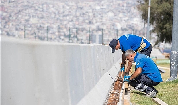 İzmir Büyükşehir Belediye Başkanı Dr. Cemil Tugay’ın 180 Günlük Hızlı Eylem Planı kapsamında yer alan Kordon’da su taşkınlarını önlemeye yönelik projenin yapım çalışmaları sürüyor. İzmir’i afetlere ve iklim değişikliğinin etkilerine karşı daha dirençli hale getirebilmek için hayata geçirilecek Kordon Acil Eylem Paketi çerçevesinde Alsancak Limanı’ndan Cumhuriyet Meydanı’na kadar olan bin 700 metrelik sahil şeridinde kıyıya paralel geçici fırtına duvarı oluşturuluyor. Olası bir afetin etkisini azaltacak çalışmalar Alsancak Limanı’ndan başladı. Temel kazıları tamamlandıkça her biri 2,40 m genişliğinde 90 cm yüksekliğindeki geçici fırtına duvarı kıyıya yerleştirilmeye başlandı. Fen İşleri Daire Başkanlığı ekipleri tarafından 500 metrelik alanda kazı tamamlanırken 350 metre uzunluğunda da beton bariyer döşendi. Çalışmalar temel kazıları tamamlandıkça Cumhuriyet Meydanı’na doğru ilerleyecek. Güzergâh boyunca oluşturulacak 30 sel kapısı acil durum uyarılarında kapatılarak denizden gelen suyun kara tarafına geçişi engellenecek. Park ve Bahçeler Dairesi Başkanlığı ekipleri de geçici fırtına duvarının her iki tarafına bahçe toprağı sererek bitkilendirme çalışmalarına başladı.